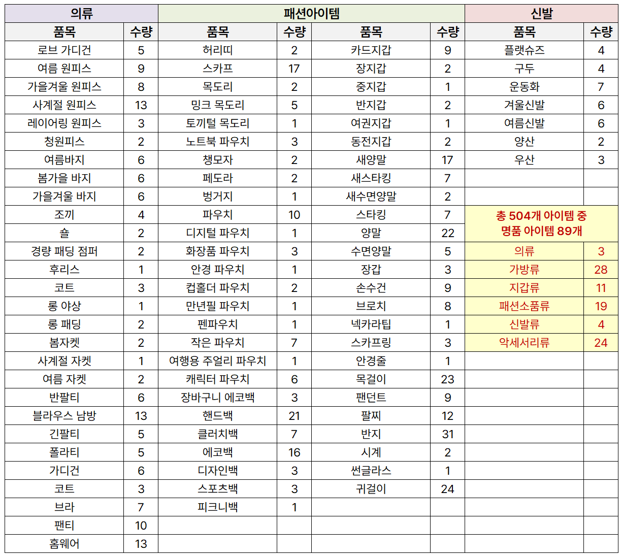 문제는 나의 의류, 패션아이템, 신발 등 사이즈가 있다 보니 나만 쓸 수 있는 편에 속하는 개인 물품들이었다. 무려 504개를 소유한 것으로 파악되었고, 가방과 악세서리가 정말 많았다.