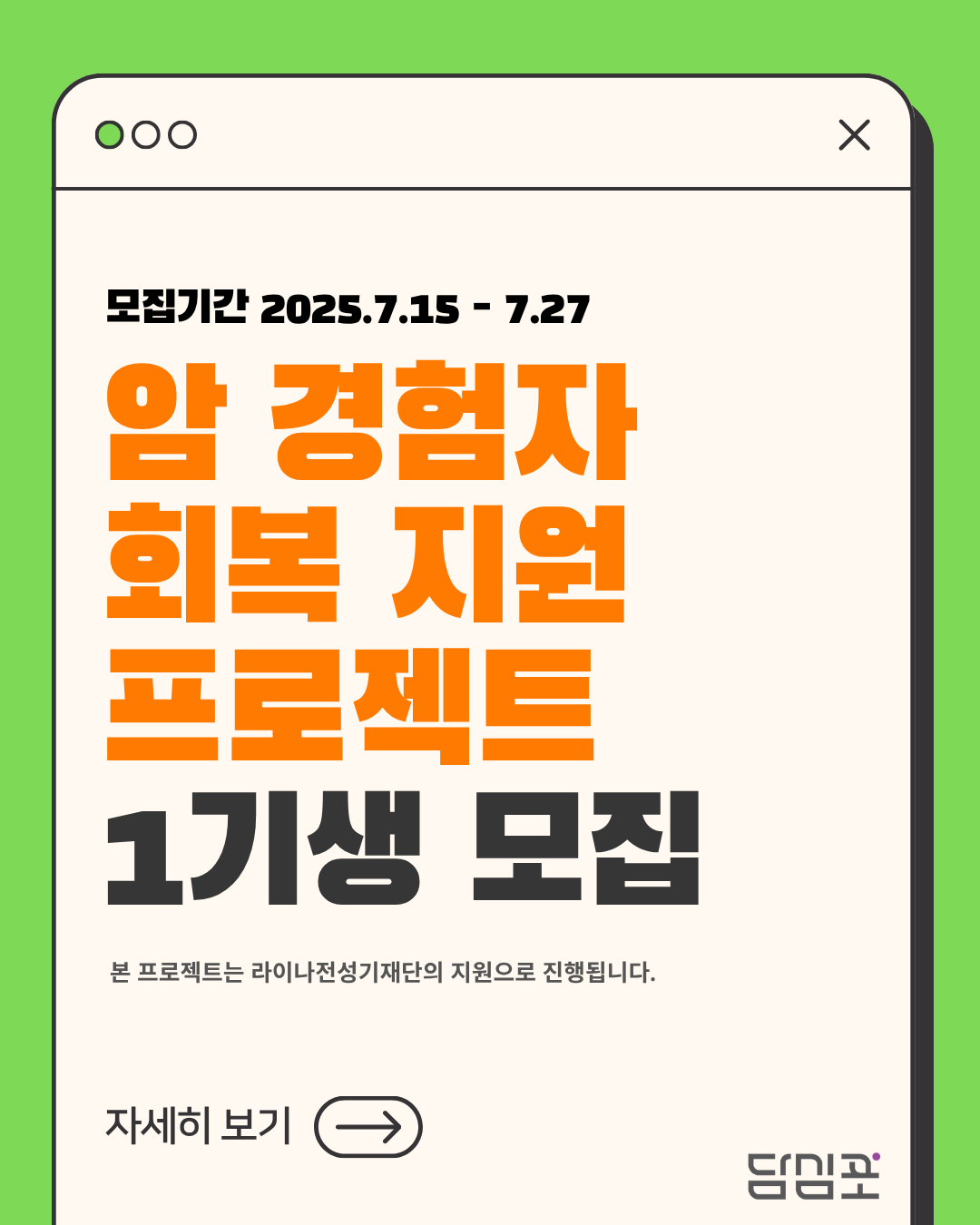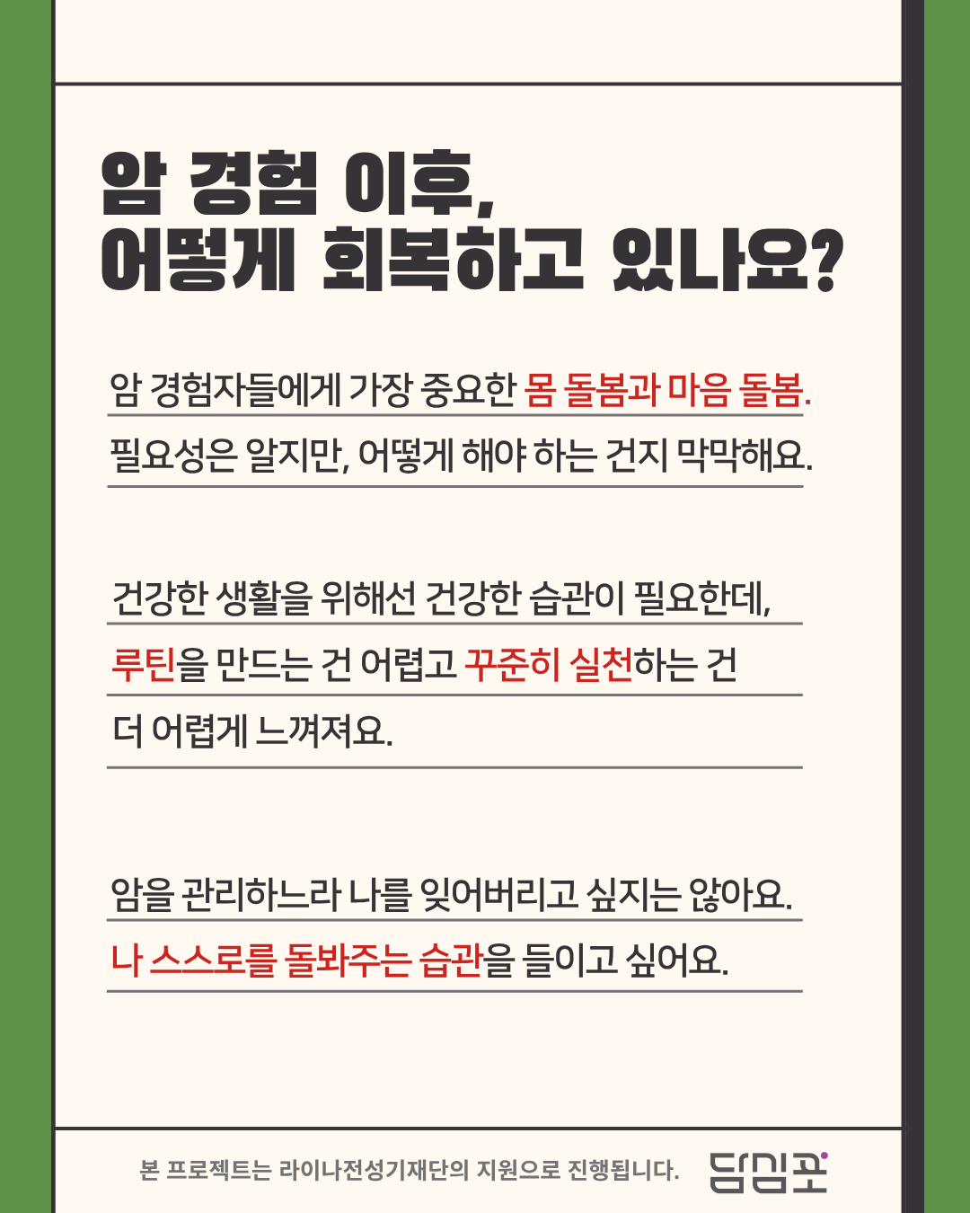 라이나전성기재단의 지원으로 진행되는 2025 암 경험자 루틴 실천 프로젝트 모집이 시작되었다.