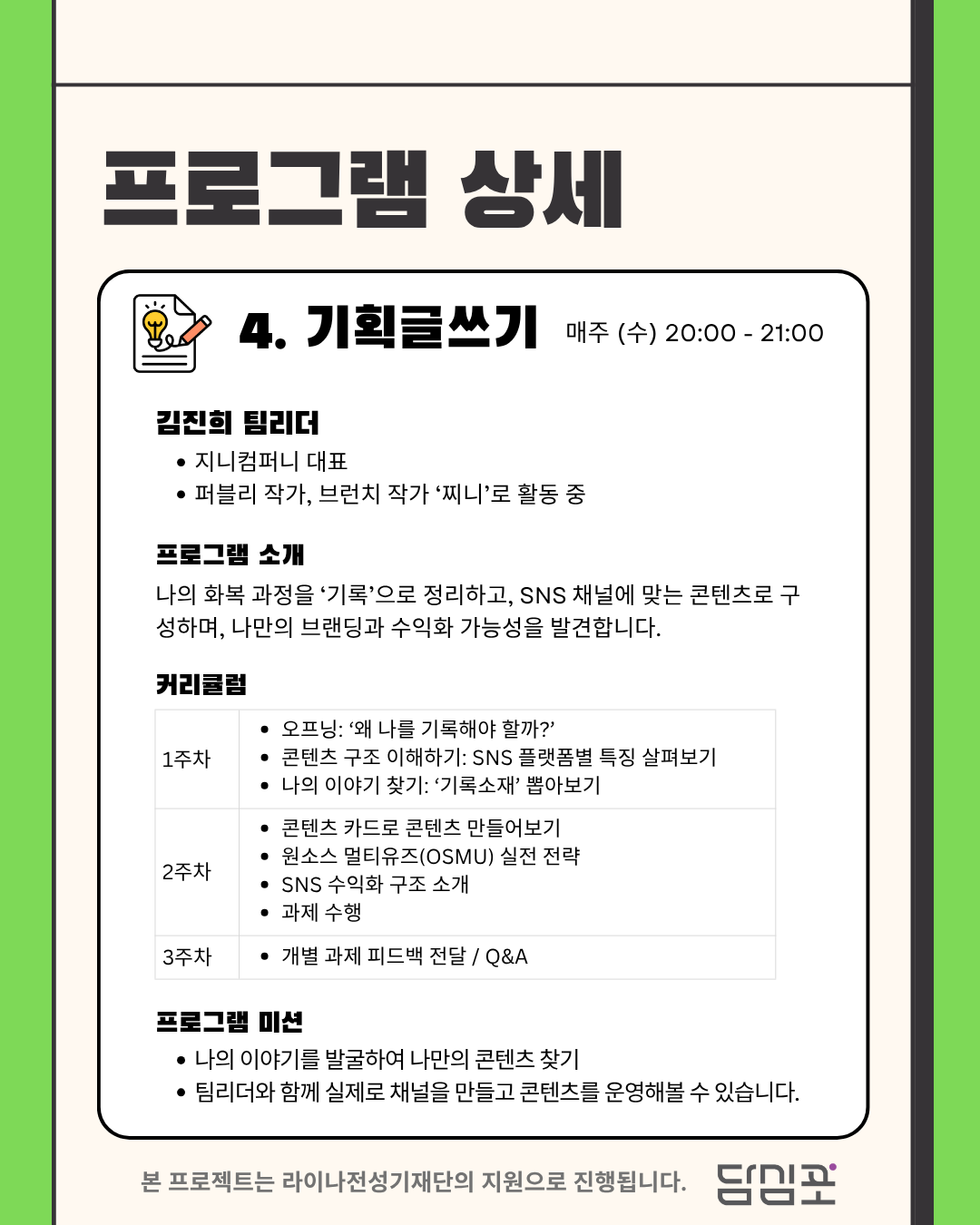 나는 여기서 '기획글쓰기' 프로그램을 맡았다. 회복 과정을 기록하며 스스로의 회복 과정을 칭찬하고, 이 기록이나 콘텐츠화하는 경험이 수익화 가능성을 발견하는 것에 도움을 주기 위한 프로그램으로 만들어 가려고 한다.