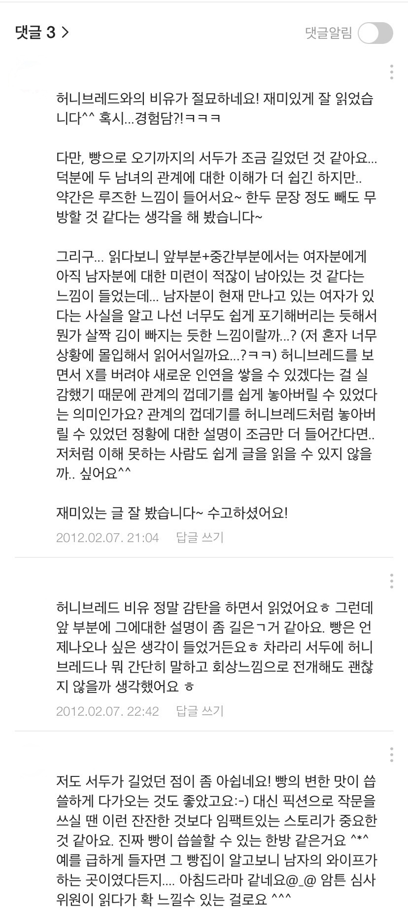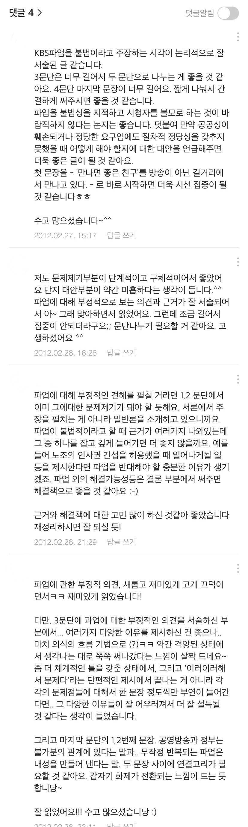 가끔 칭찬이 있었고, 대체로 글감을 신선하게 잡아서 새로운 시작으로 전개한다는 평을 받았는데 이건 좋은 평가.
