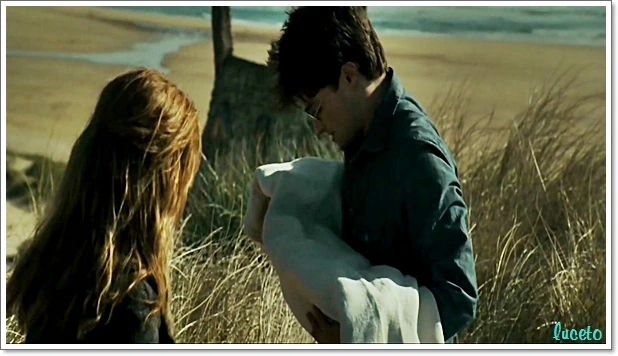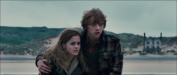 4. 이러한 빛의 활용뿐만 아니라 <죽음의 성물 1부>는 셔레이드의 활용, 연출, 카메라 기법에 이르기까지 전작에서 보여주지 못한 놀라운 광경을 선사한다. 셔레이드부터 살펴보면, <죽음의 성물 1부>는 헤드위그의 죽음/ 론과 헤르미온느의 손이 닿을 듯 말 듯한 장면/해리와 헤르미온느가 춤을 추는 장면에 이르기까지 대사를 거의 활용하지 않으면서도 제스처와 움직임, 상징의 활용을 통해 영상만으로도 캐릭터의 성장, 캐릭터 간의 관계 변화를 훌륭하게 전달해낸다.