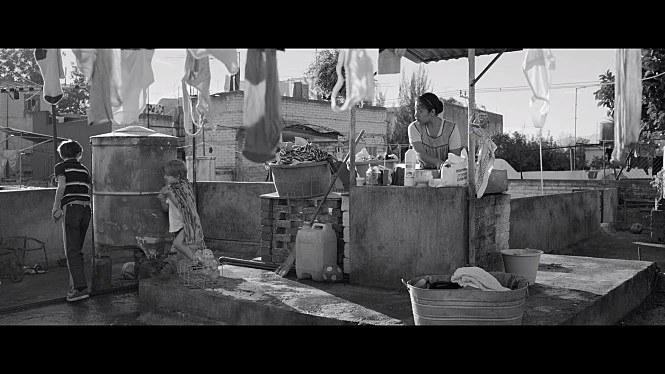 2. 알폰소 쿠아론 감독은 '롱 테이크' 기법을 적극적으로 활용하는 감독이다. 그는 <칠드런 오브 맨>과 <그래비티>는 모두 화려하고, 감각적이면서 스토리 진행에 있어 가장 핵심적인 시퀀스를 롱 테이크로 담아내서 모두를 놀라게 한 바 있다. <로마>에서도 그의 카메라는 끊어지지 않는다. 작중 대표적인 장면이 세 장면이 있다. 주인공인 '클레오'가 밤에 마지막으로 집을 정리하는 장면, 극장에서 클레오가 임신을 했다고 남자친구에게 고백하는 장면, 클레오가 병원에서 끝내 유산하는 장면이 그것들이다. 이 장면들은 이 작품의 전체적인 톤을 가장 잘 보여주는 장면들이다.