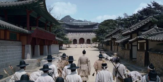 4. 사실 모든 드라마의 두 번째 시즌은 필연적으로 신선함이 부족하다는 문제를 내포한다. <킹덤>도 마찬가지다. 한국형 좀비물, 사극형 좀비물이 남긴 최초의 충격은 재현할 수 없기 때문이다. 시즌 2의 연출로 새롭게 합류한 박인제 감독은 디테일한 연출로 차별화를 꾀한 것처럼 보인다. 이번 시즌에서는 특히 소리를 활용한 연출이 돋보이는데, 보이지 않는 장애물 너머에서 벌어지는 일들이 순전히 소리를 통해 전달되는 장면은 건물 안의 있는 사람들의 시선에서 극도의 공포감을 맛보게 만든다. 또한 스케일을 한 층 키운 것도 눈여겨볼 대목이다. 첫 번째 화에서 펼쳐지는 좀비와의 전투씬, 이후 등장하는 연과 대포를 활용한 전투, 마지막 궁궐 내에서 수직과 수평으로 움직이며 펼치는 좀비와의 사투는 시즌 1에서 볼 수 없었던 스펙터클을 선사한다.