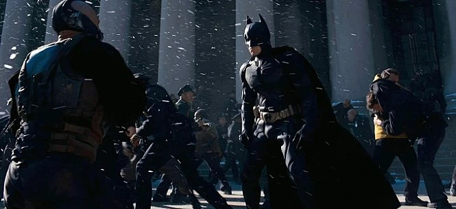 2. <다크 나이트 라이즈>는 자신이 전체 시리즈의 맥락 안에서 평가받아야 하는 이유를 영화 초반부터 강조하고 있다. 빌런인 베인을 소개한 후 영화는 하비 덴트 기념식을 비추면서 모든 이야기를 시작하는데, 이 기념식은 그 자체로 지난 시리즈들과의 연결고리다. 기념식이 열리는 장소인 웨인 저택은 <배트맨 비긴즈>에서 파괴되었다가 비로소 재건된 장소로, '라스 알 굴(리암 니슨)'을 위시한 어둠의 사도들과의 싸움이 다시 일어날 것임을 암시한다. 고든 청장의 연설은 거짓으로 가득한 하비 덴트의 죽음이 끼친 영향력을 일깨우면서 <다크 나이트>와의 견결점을 강조한다. 이처럼 영화의 시작부터 전작들과의 연결고리가 드러나는 것은 <다크 나이트>와 차별화된 대목이기도 하며, 이 작품이 시리즈의 맥락에서 이해되어야 할 이유이기도 하다.