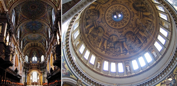 길게 뻗은 십자가의 세로 부분을 따라 성당 내부를 구경하다 보면 십자가의 가로와 세로가 만나는 돔 아래에 이르게 된다. 돔에서 천장을 올려다보면 12 사도와 다른 성인들의 조각, 여러 성경화들이 장식되어 있는데 흥미로운 것은 이 조각들과 그림들의 특징이 조금씩 다르다는 점이다. 실제로 이들 중에는 카톨릭의 영향을 받은 듯 화려한 색채로 감정 표현이 풍부한 작품이 있는가 하면 그보다 절제된 모습으로 개신교의 영향을 받은 듯한 작품들도 함께 배치되어 있다. 영국(잉글랜드)의 국교인 성공회가 비록 개신교의 교파이기는 하나 카톨릭의 전통과 교리를 상당 부분 포함하듯이, 세인트 폴 대성당 역시 과거의 예술과 완전히 단절하지는 않는 형식을 보여주는 셈이다. 또 이는 아직까지도 왕실과 귀족, 계급 등이 남아 있는 영국 특유의 온건한 국민정서의 단면을 보여주는 부분이라고 생각해 볼 수도 있지 않을까.