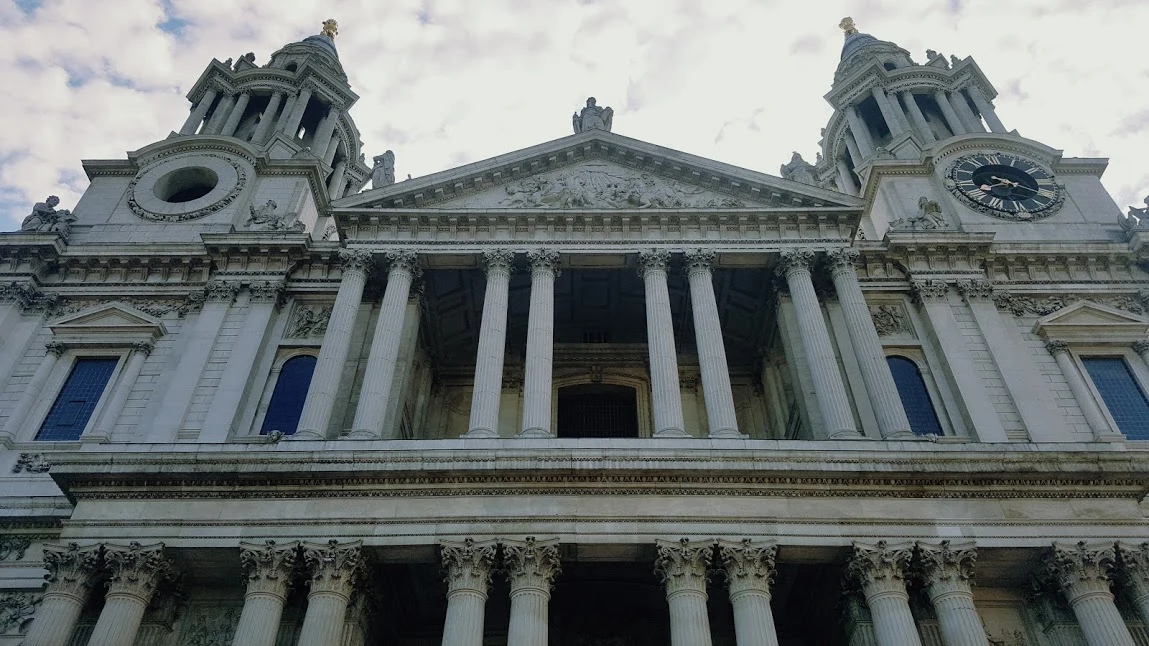 세인트 폴 대성당을 정면에서 바라본 모습. 바로크 양식이 잘 살아있는 두 개의 첨탑과 부조, 기둥들이 인상적이다.