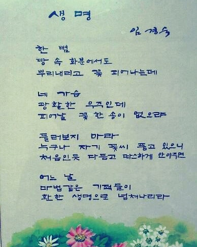 화초를 좋아하는 어머니가 형이랑 나를 생각하며 쓴 시란다. 몇 년 동안을 방에 걸려 있었지만 제대로 보진 않았었다. 지난 주말 몸이 안 좋아 종일 누워있던 방 안에서, 익숙했지만 낯선 이 시를 다시 보았다. 나는 누운 채로 시를 따라 읽었다. 뿌리, 꽃, 가슴, 우주, 기적, 생명.. 시어 하나하나를 읽어나갈 때마다 나는 조금씩 기운을 차렸다. 글이 품고 있는 에너지가 내게 전이되는 것만 같았다.