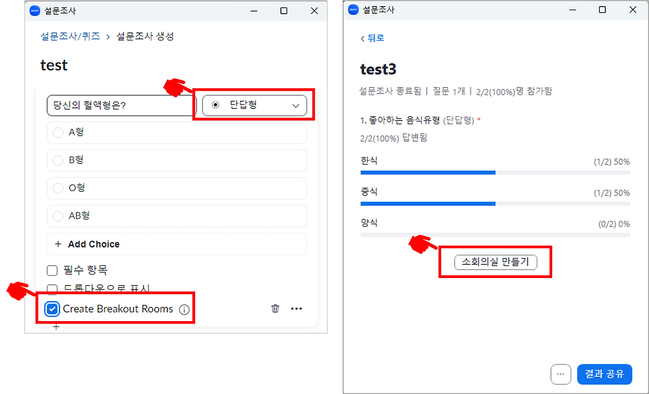 호스트가 설문 결과에서 소회의실을 만들도록 설정이 활성화된 경우, 호스트는 참가자가 응답한 결과를 기준으로 소회의실을 만들 수 있습니다. 참가자 정보가 충분하지 않은 상태에서 조(소회의실) 편성하기 어려웠는데, 참 유용한 기능입니다. 만약, 혈액형 별로 조를 편성하고 소회의실로 모이도록 하고 싶다면, 설문조사에서 혈액형을 선택하도록 하고 응답한 결과대로 소회의실로 이동하게 할 수 있지요.