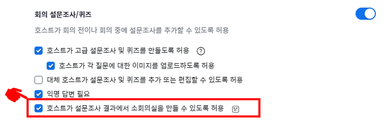 이를 위해서는 먼저 ZOOM 홈페이지 에서 > 설정 > 회의중(기본) > 회의 설문조사/퀴즈 에서 "호스트가 설문조사 결과에서 소회의실을 만들 수 있도록 허용"을 체크하여 활성화해주세요.