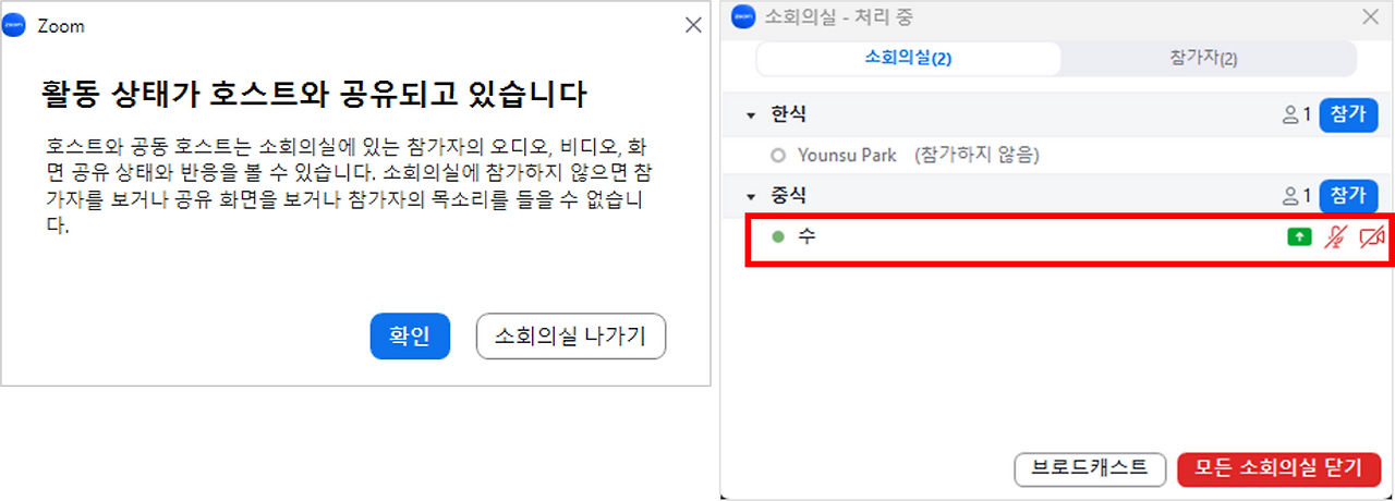 소회의실 목록을 보면 기존에는 소회의실로 이동했는지 여부만 알 수 있었는데, 지금은 오른쪽에 마이크와 비디오 상태를 볼 수 있답니다. 참가자에게는 소회의실로 이동할 때 '활동 상태가 호스트와 공유되고 있다'는 안내가 공지됩니다.