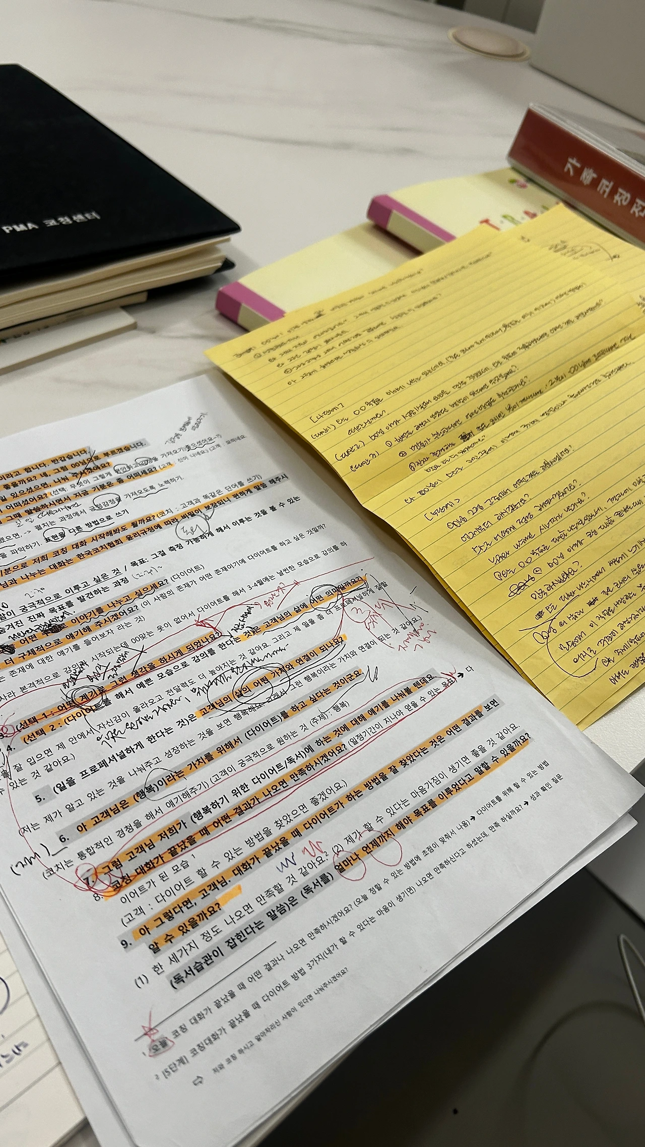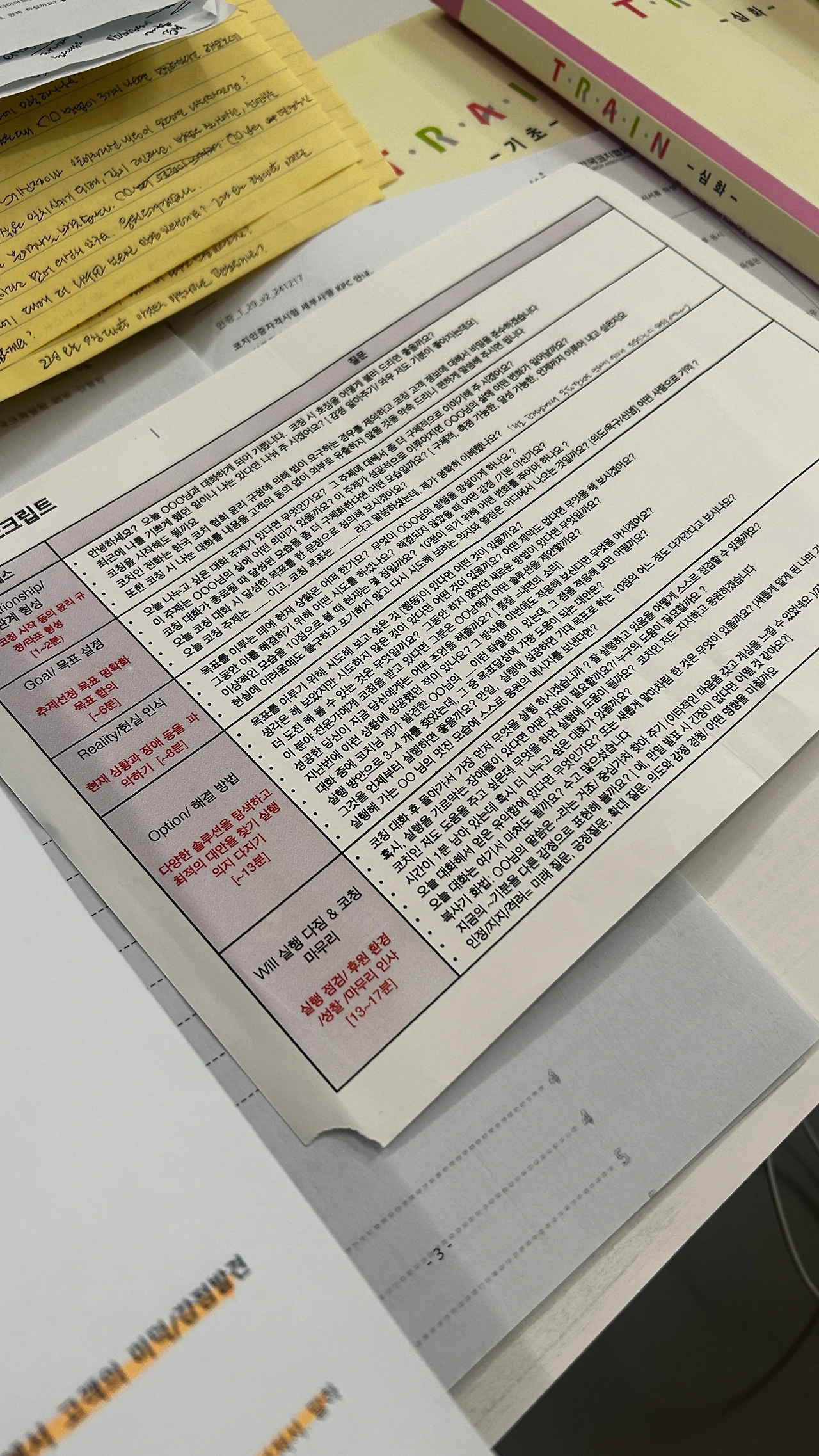 기본 코칭 대화 모델이 있으며, 나만의 방식으로 문구와 질문을 만들어서 준비한다. 계속 손으로 적고, 실습을 해나가면서 나만의 최종 스크립트를 만들어 면접을 보았다.