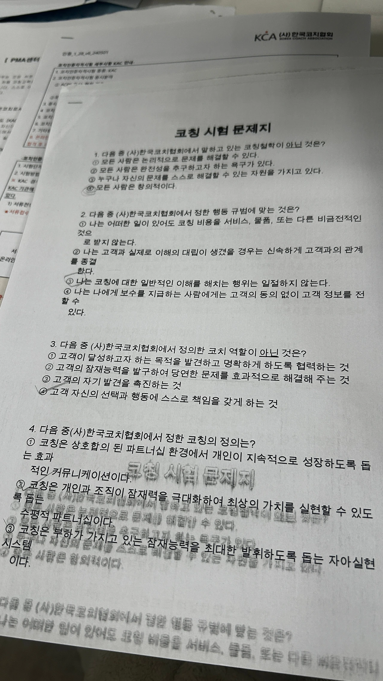 한국코치협회 코칭 역량 모델, 윤리규정 등에 대해 익히고, 코칭에 대한 기본 개념을 숙지했는지 확인을 위한 필기시험을 진행한다.