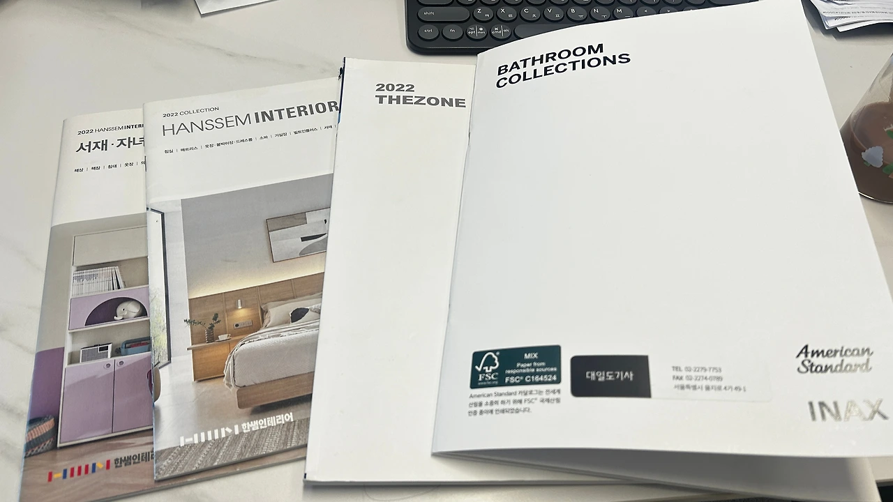 마지막으로 여러 업체 카타로그를 구해와서 어떤 제품으로 수전, 휴지걸이, 수건 걸이, 욕조 등을 설치 할 것인지에 대해 고민했고, 선택해 놓았다. 애매 한 것은 후보지를 준비해서 담당자와 상의 했다.