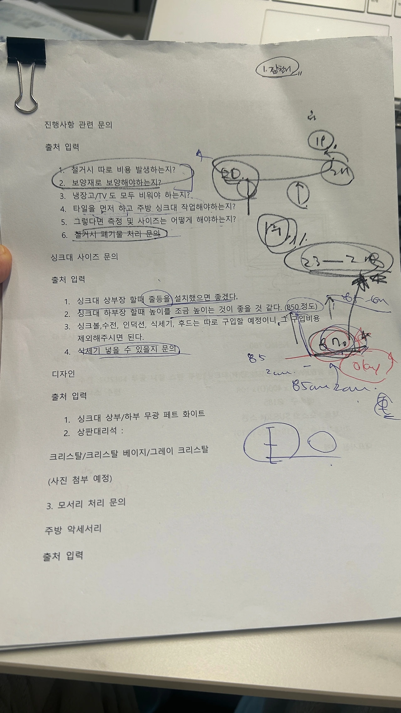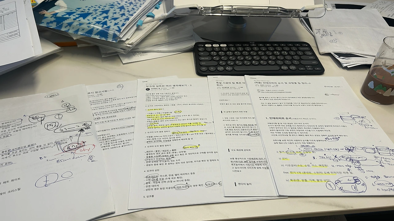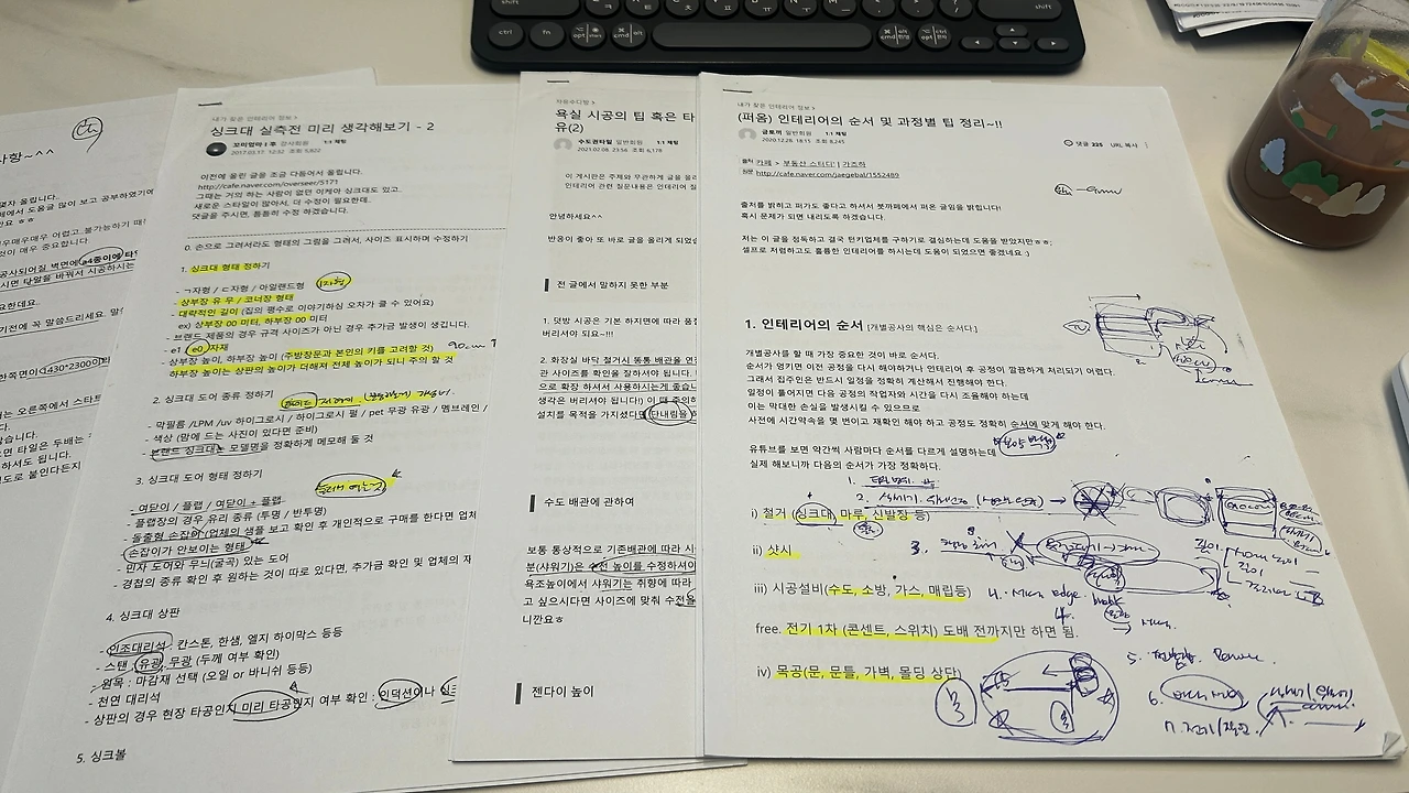 아래 사진에서와 같이 프린트를 해서 여러 자료들을 읽어보고, 커뮤니티에 질문도 하면서, 어떻게 우리만의 주방과 욕실을 만들어갈지를 구상한다. 여러 사람들의 후기와 조심해야할 점. 참고해야할 점 들을 나눌 수 있어서 정말 감사하고, 다행이었다. 물론 우리도 완벽하지는 않았지만 이외 많은 리스크를 줄일 수 있었다. 아래는 나름 열심히 리서치한 흔적이다. PC에도 유익한 자료는 따로 폴더를 만들어 저장 해 두었다.