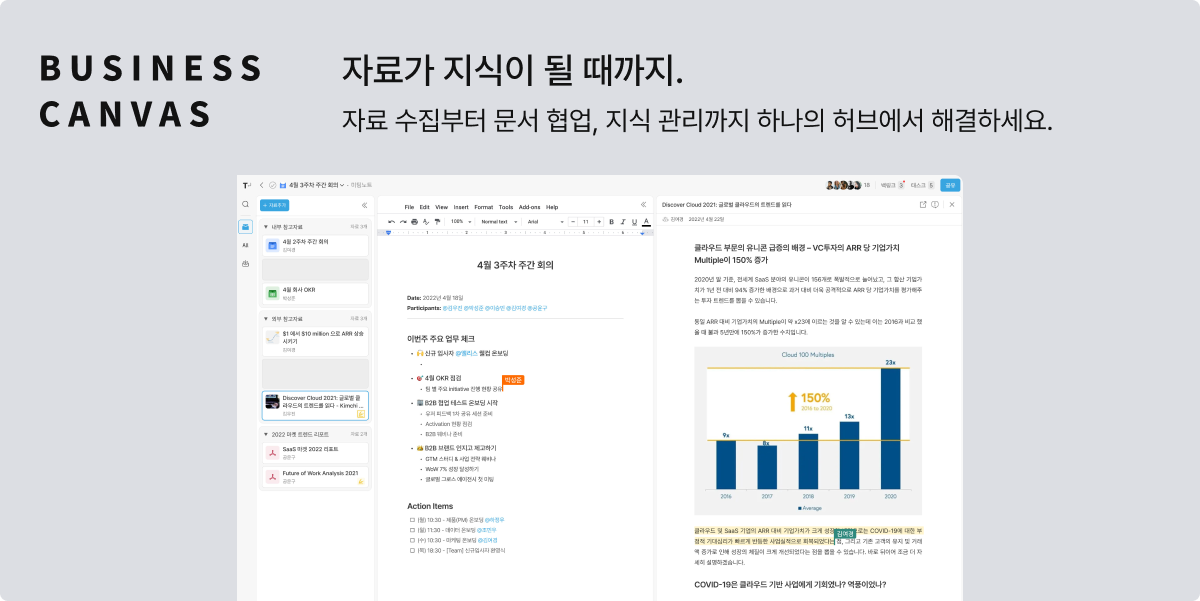 비즈니스캔버스는 자료가 지식이 될 때까지, 자료 수집부터 문서 협업, 지식관리까지 하나의 허브 프로덕트인 타입드를 만들고 있습니다. 창업한지 약 2년만에 약 100억 원이라는 투자금을 유치하기까지 어떤 과정을 겪었고 무엇을 배웠는지에 대해 나눠주셨습니다.
