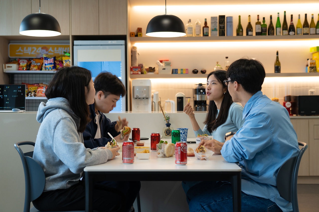 회의실의 건너편에는 별도의 소파 공간이 있어요. 이곳에서는 휴식을 취하거나 집중이 안될 때 와서 업무를 하기도 합니다. 때로는 팀원들과 여러 이야기를 나누기도 하는 만능 공간이죠. 오며 가며 이곳에서 일하는 팀원을 볼 때면 어느 분위기 있는 카페의 한 공간처럼 느껴지기도 합니다.