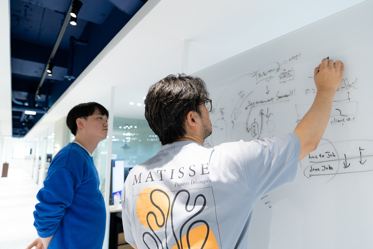 포자랩스는 사일로 현상을 지양합니다. 팀원들 간 원활하고 투명한 소통을 위해 개방된 공간으로 디자인했어요. 그리고 각 팀마다 화이트보드를 1개씩 비치해 두었습니다. 화이트보드에 함께 스케치하며 신속하게 아이디어를 주고받을 수 있도록 준비했어요.