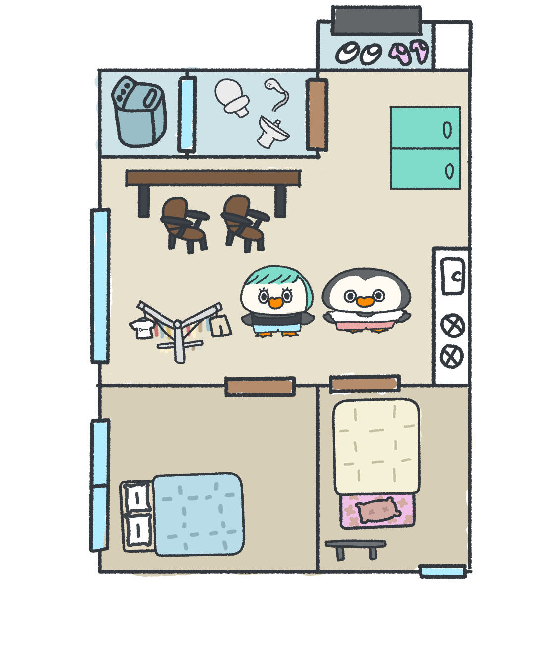 처음 써 보는 방 두 개짜리 집. 주황색 크레파스 낙서 자국이 있는 방문과, 귀여운 눈코입 스티커가 붙어 있는 화장실 변기 뚜껑, 별 모양 야광 스티커가 붙어 있는 거실과 화장실 스위치까지. 이전 세입자가 남겼을 그 낯선 흔적들이 있는 공간에 나의 익숙한 짐들이 들어왔다. 재수생 때부터 썼던 이불, 앉은뱅이책상, 빨랫대가 그것이었다. 하지만 이번에는 새로운 짐들도 추가되었다. 동생의 짐들이 들어온 것이다. 동생의 이불과 책상, 옷들이 들어왔다. 동생과 함께 쓸 4인용 입식 책상도 새로 생겼다. 그 책상은 거실 겸 부엌에 놓여 tv를 보고, 공부도 하고, 밥도 먹을 수 있는 공용 공간이 되어주었다.