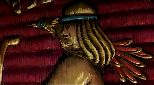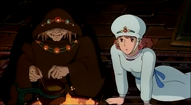 이러한 신화에 영향을 받는 것은 초등학생 관람객뿐만이 아니다. 영화 속 나우시카가 사는 세계에도 전설이 존재한다. 나우시카는 바람계곡의 예언자(왼쪽 사진의 왼쪽 인물)로부터 예전부터 전해온 벽에 그려진 한 남성에 대한 전설에 대한 이야기를 듣는다. 예언자는 말한다. "푸른 옷을 입고, 황금벌판에 내려선 자. 잃어버린 대지와의 인연을 다시 맺어 우리를 푸른대지로 인도할 지어다."라고. 그 말을 들은 나우시카의 표정이 심상치 않다.