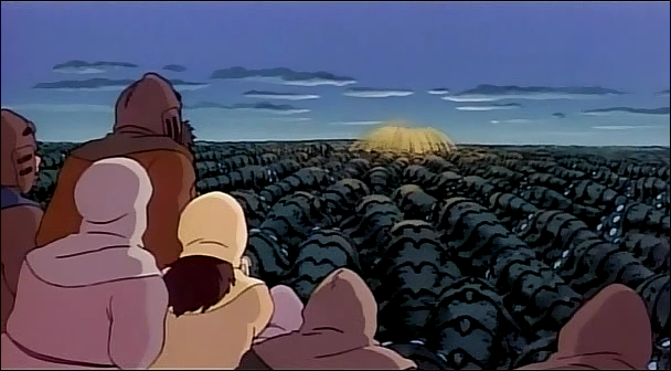 나우시카와 새끼 오무는 치이지 않을 수 없었다. 강한 충격에 하늘로 튕겨져 버린 나우시카를 멀리서 지켜보는 바람계곡의 사람들은 그녀가 죽었을 거라 예상하지만, 매서운 행진을 멈춘 오무들이 그들의 신비한 노란 촉수로 쓰러진 나우시카를 치유한다. 극적으로 부활한 나우시카는 그녀가 이전에 들었던 전설처럼, 파란 옷을 입고서 노란 촉수로 이루어진 황금벌판을 걷는다.
