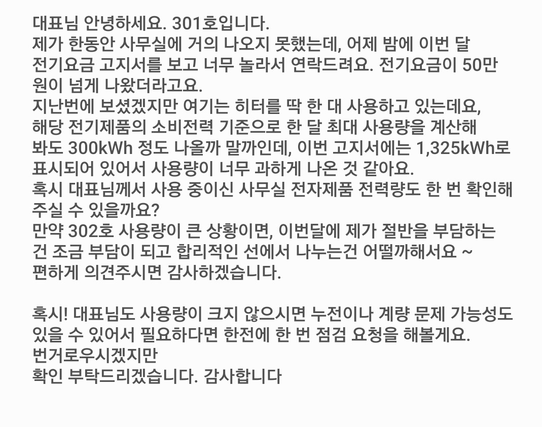 처음에 계약할 때 전기세 별로 안나오니 옆집이랑 쓰는 전기량 합산해서 내라고 할때 순진하게 믿었는데, 옆집이 이렇게 전기를 폭주하며 쓸 줄이야. 앞으로 더 큰 계약할 때 이런 변수를 생각하며, 안일하게 생각하지 말아야지 라는 교훈을 얻었음에 감사합니다.