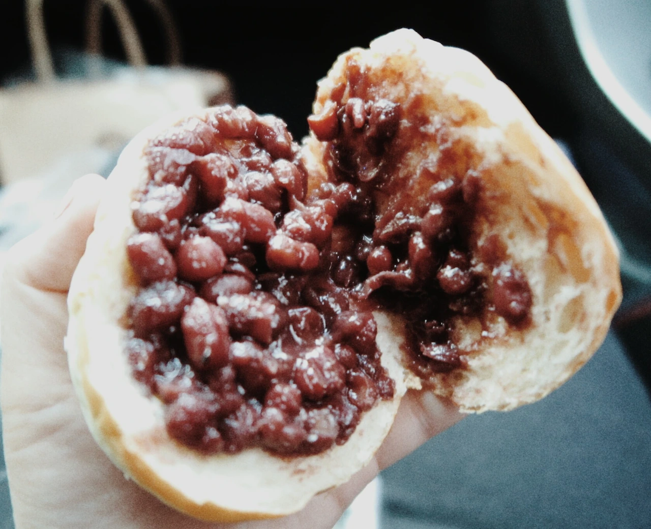 어쨌든 뿌듯한 마음으로 단팥빵을 쥐고 나서는 길. 차에 타자마자 바로 맛을 봤다. 크기는 작지만 생김새는 독특한 녀석. 앞모습은 영락없는 모닝빵인데 윗부분을 들추니 푸짐한 팥소가 눈에 들어온다. 팥은 빙수에 들어가는 것과 비슷한 자태.