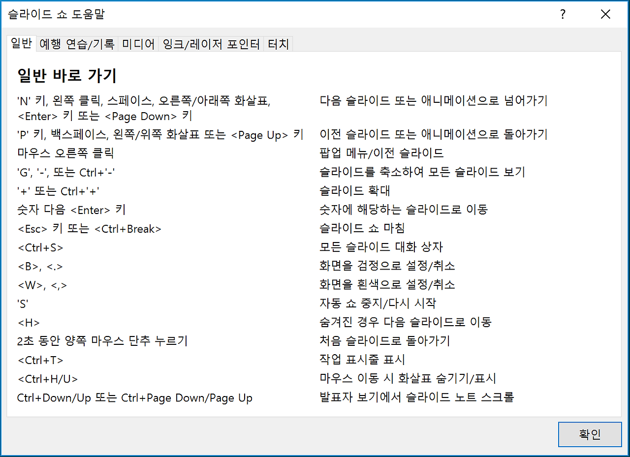 도움말에는 일반, 예행연습/기록, 미디어, 잉크/레이저 포인터, 터치로 구분되어 있고 비교적 많은 기능들이 있다. 하지만, 위의 기능을 모두 숙지할 필요는 없다. 필자의 발표경험으로 숙지하면 좋은 기본적인 기능은 다음과 같다.