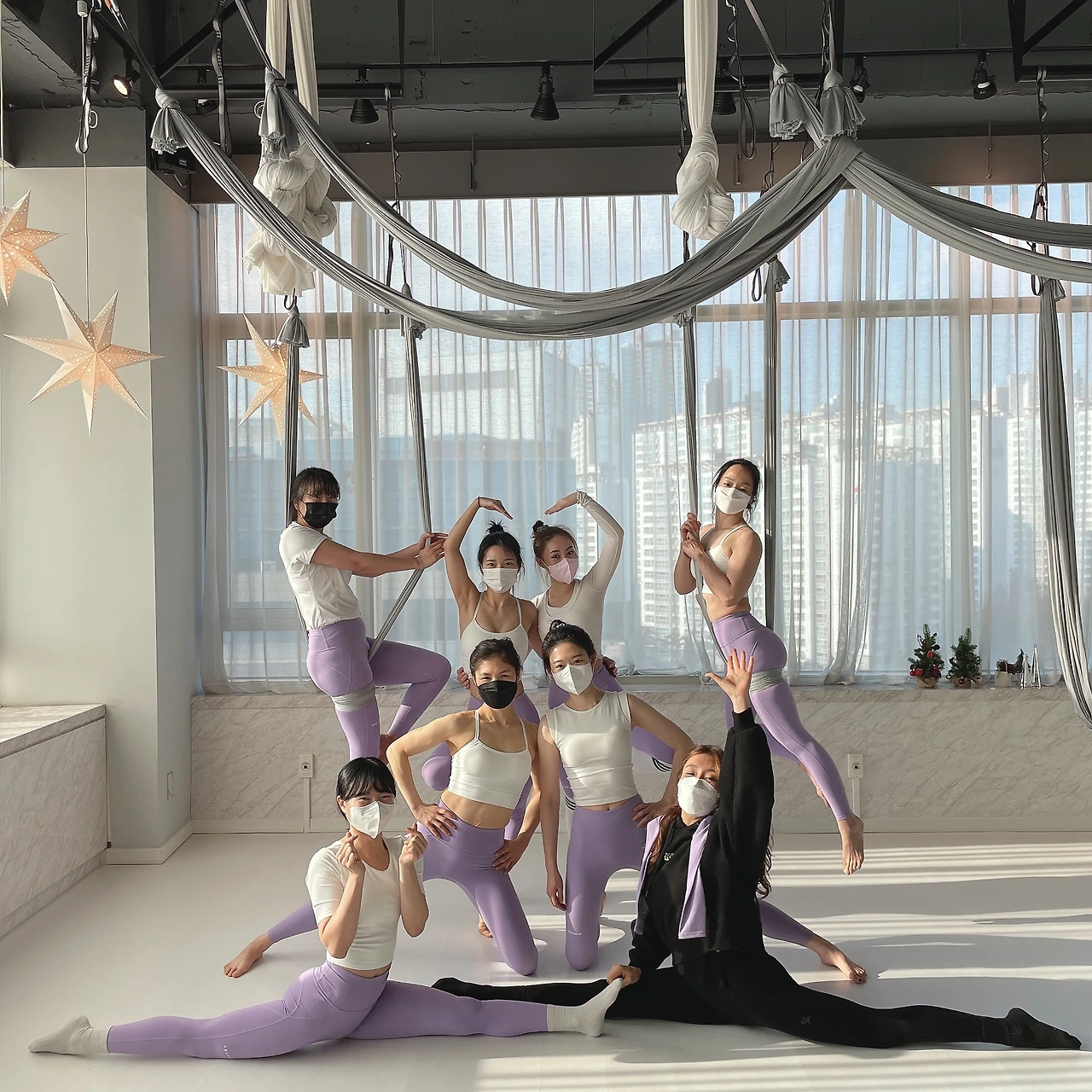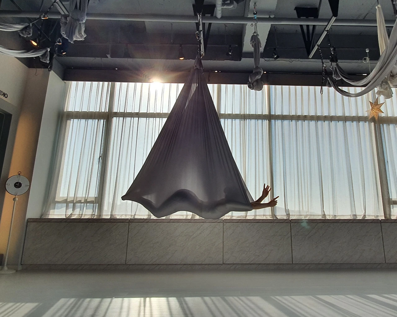 플라잉요가는 인간 실뜨기다. 묶고 풀리는 과정이 흥미롭다.인생 실마리를 푸는 것처럼, 베베 꼬인 내 마음을 푸는 것처럼. 답답한 속도 회포 푼다. 플라잉 지도사 시험 준비할 때 동작 티칭을 외우느라 하도 연습했더니 혈색과 몸이 왜이리 좋아졌느냐는 말을 들었다. 몸을 칭칭 감는 게 특효약임엔 틀림 없다.
