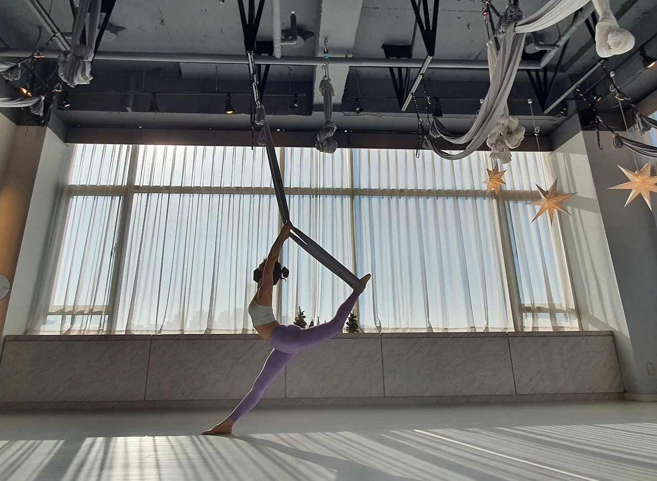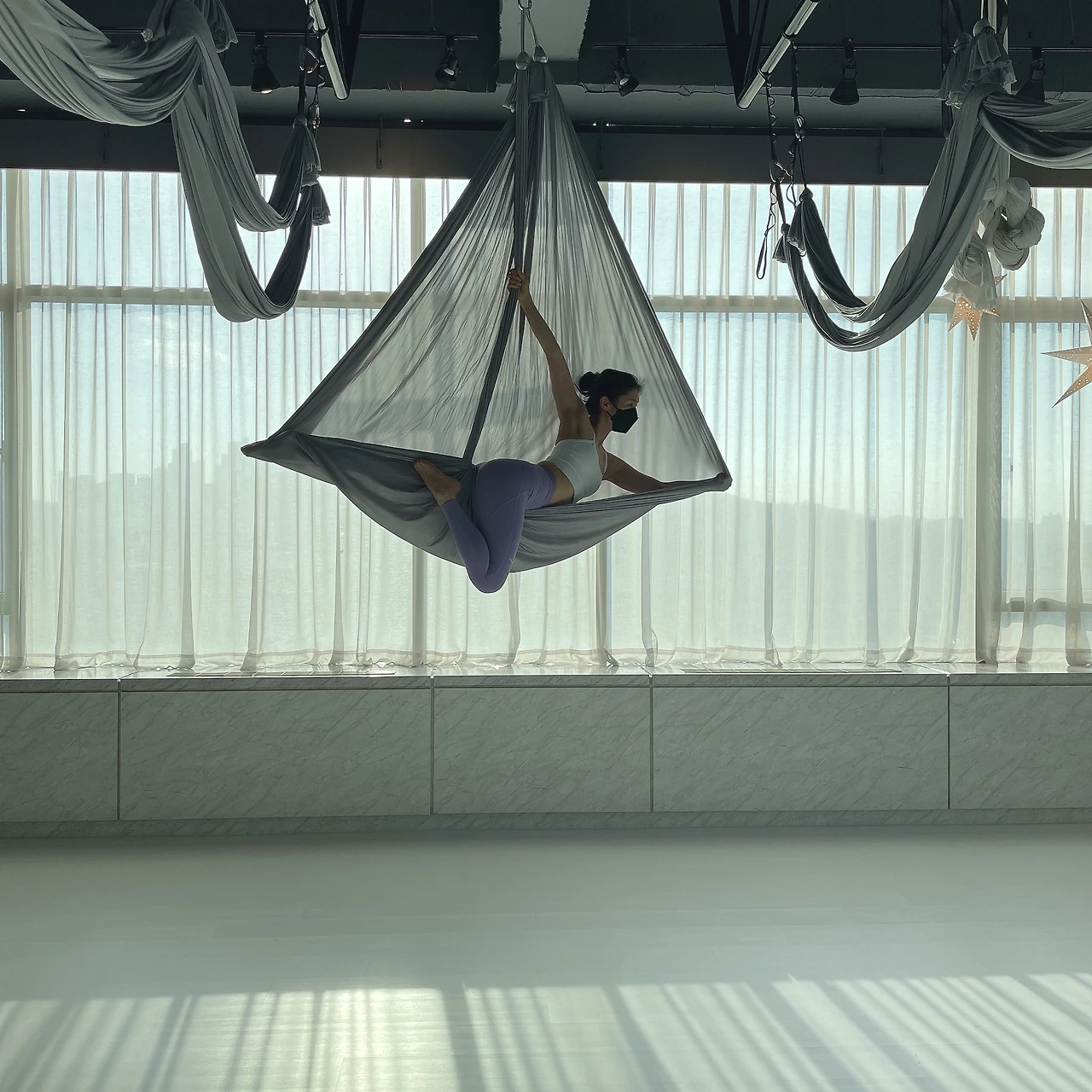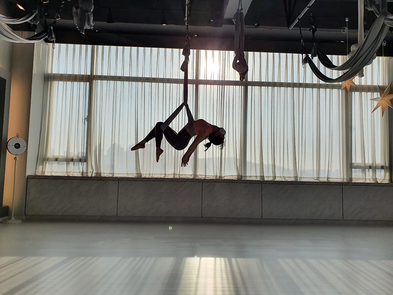 플라잉요가는 천장에 매달린 실크(해먹)를 이용해 몸을 뒤집는 동작이 많다. 다함께 박쥐도 됐다가 원숭이나 개구리도 된다. 뒤집어진 눈들이 빼꼼빼꼼 바라봐도 민망할 것 없이 건강만 챙긴다. 살면서 척추를 앞뒤좌우로는 수도 없이 움직이지만 머리와 발이 뒤바뀔 일은 거의 없다. 척추가 중력에게 먹잇감을 갖다바치는 꼴이다. 플라잉요가는 뒤집기만 해도 롯데샌드 같던 척추가 마카롱만큼 넓어질 수 있는 대박 찬스다.