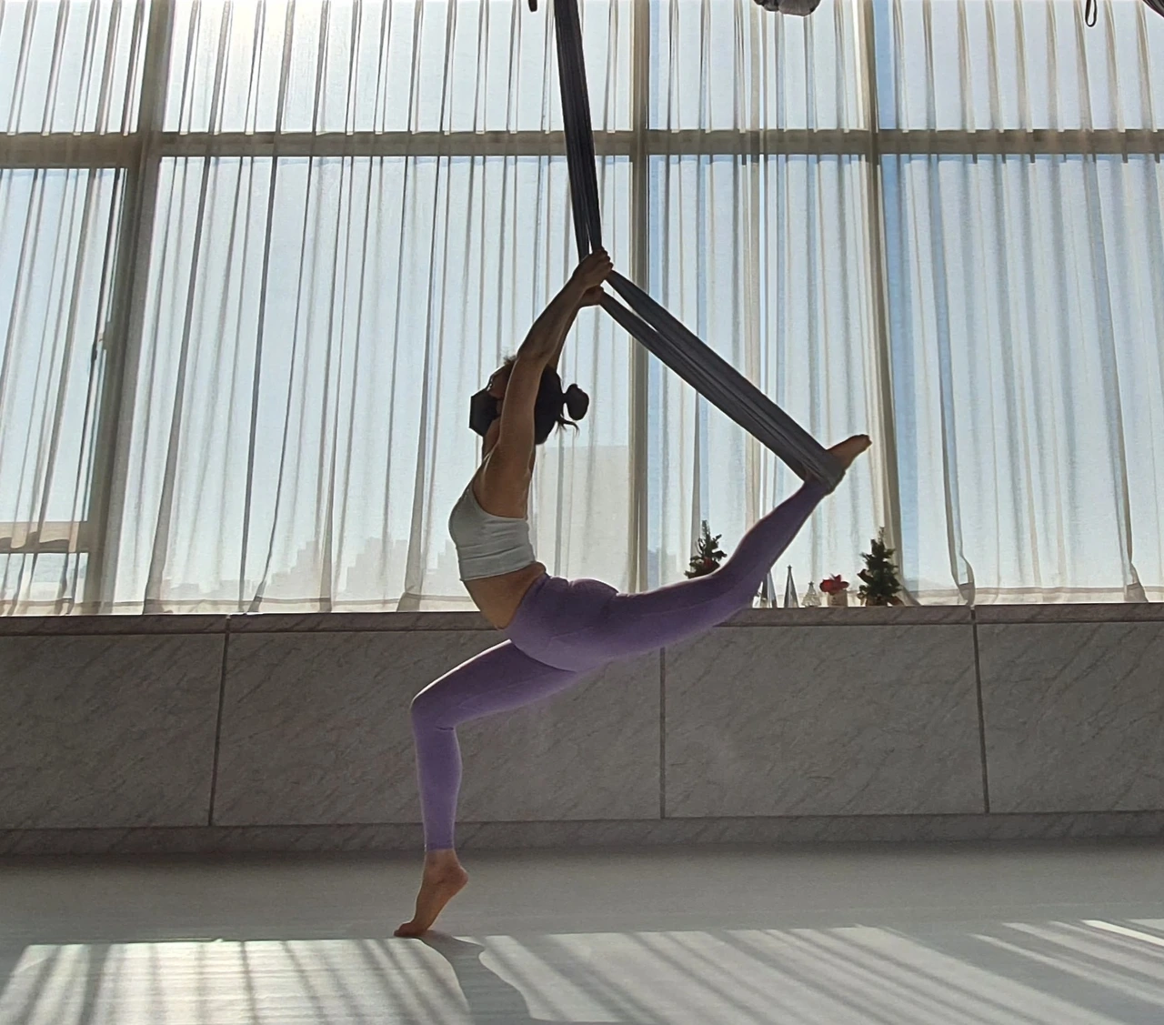 플라잉요가라 해서 공중부양만 하는 건 아니다. 근력과 유연성, 신체균형, 수련 등을 겸비한 운동이라 해먹으로 할 수 있는 동작은 무궁무진하다. 눕고 앉고 서고 나는, 자세만으로도 벌써 4가지이니 관련 동작은 얼마나 다양하겠는가. 바닥에서는 해먹의 도움으로 강도 높은 근력운동과 스트레칭을 할 수 있다. 해먹을 허벅지에 감아 높게 올라가는 동작은 코어, 등근육, 유연성 코스다. 기껏 올라왔는데 바닥까지 가서 새로운 동작을 하기보다는 내려가는 길에 다양한 동작들과도 연결된다.