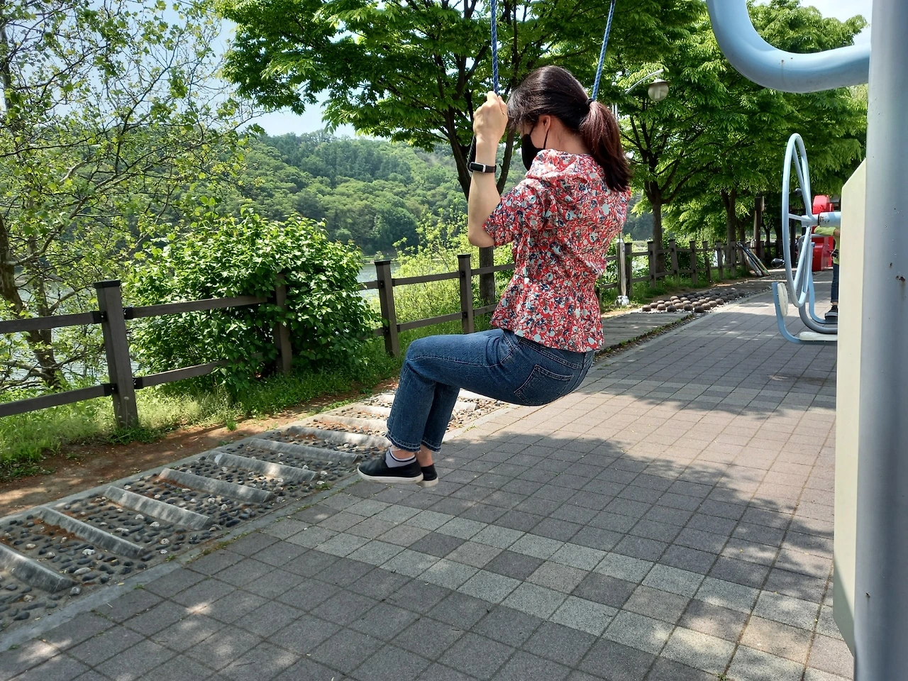 함께 걷던 중 끈이 대롱대롱 매달린 운동기구를 보자마자 플라잉 요가나 폴댄스를 연출해 보라며 합창 한다. 애프터 신청을 받아내고 싶어하는 후까시 청년 마냥 늘어난 몸무게고 자시고, 경단녀 아닌 운단녀 임에도 단숨에 매달렸다. 갈비뼈 골절 후 처음 내딛은 팔! 힘!