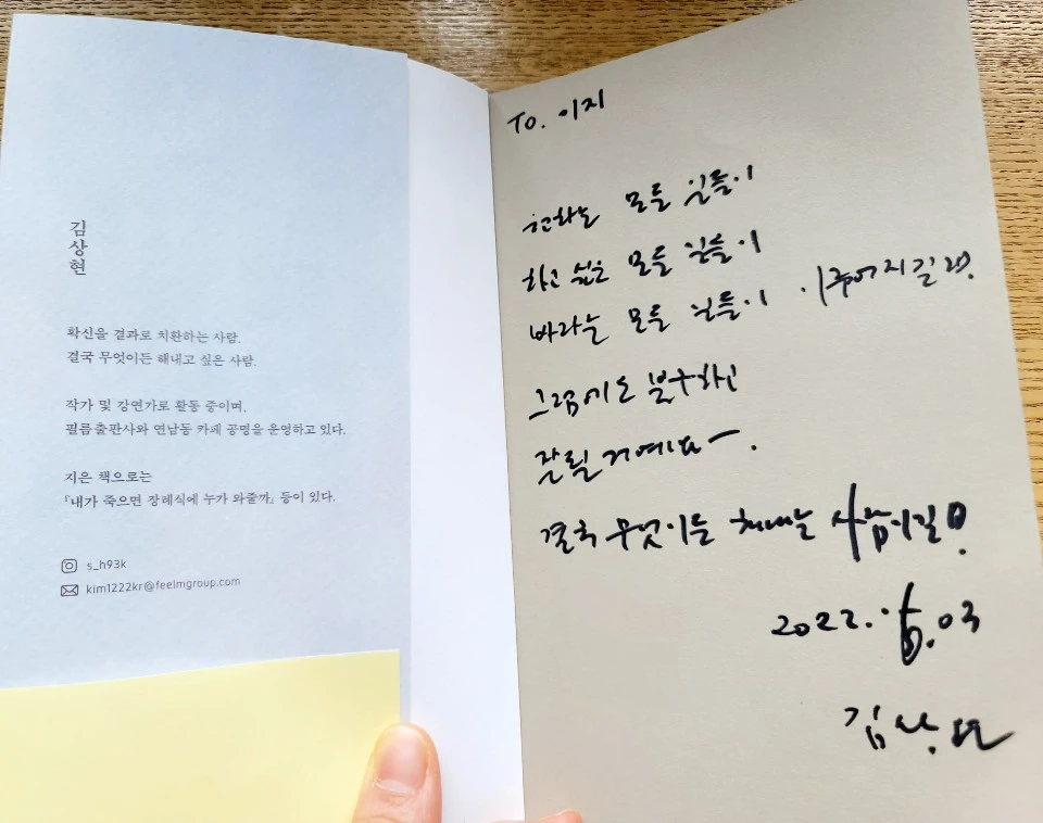 내 마음 속 에필로그이기도 하다. 먼저 밝혀줘서, 내가 피곤하게 사는 사람인가, 내가 예민한가, 라는 자책에서 해방시켜줘서, 어떻게 중심잡고 행복하게 살 것인지를 풀어줘서, 이래저래 다행이고 감사하다. 젊은 나이임에도 온갖 역경을 감수하고 다른 이들 그림자에는 햇살을 내비치고 있다. 한 글자 한 글자에 꾹꾹.