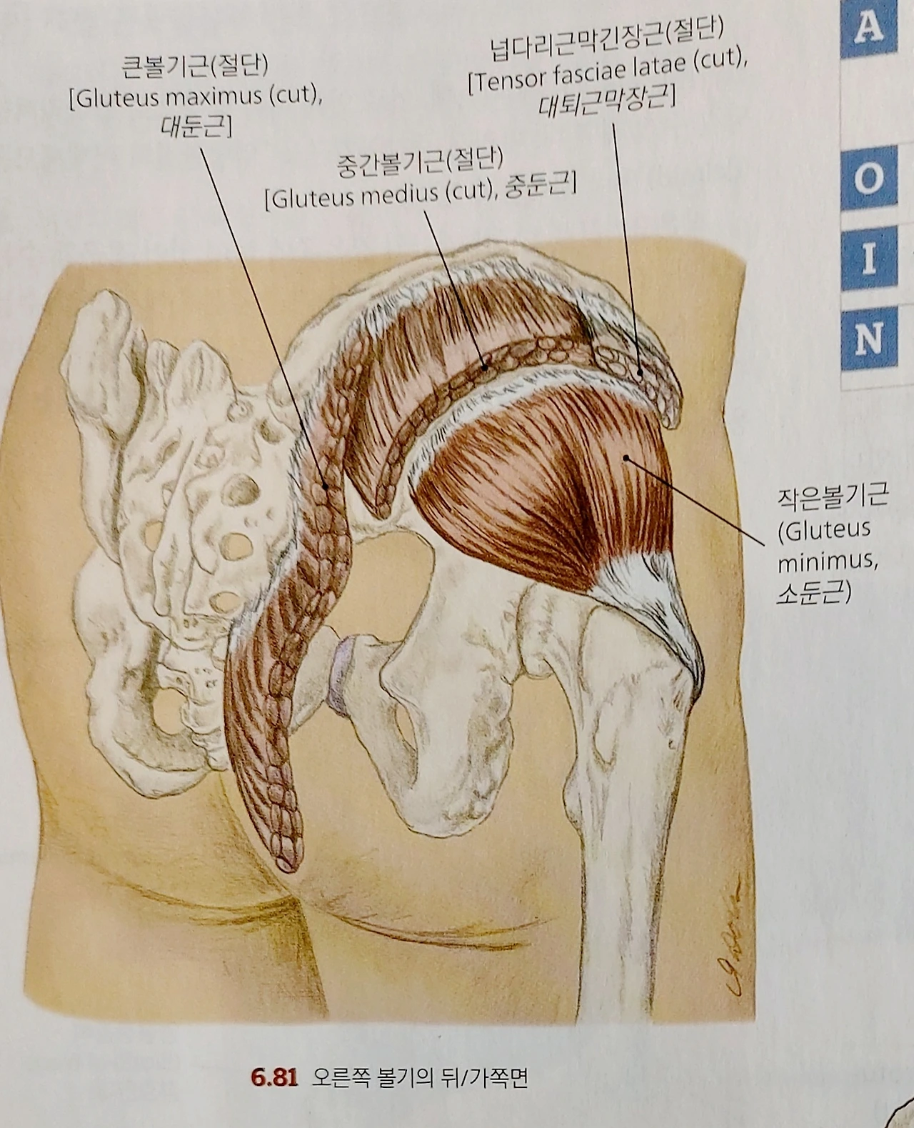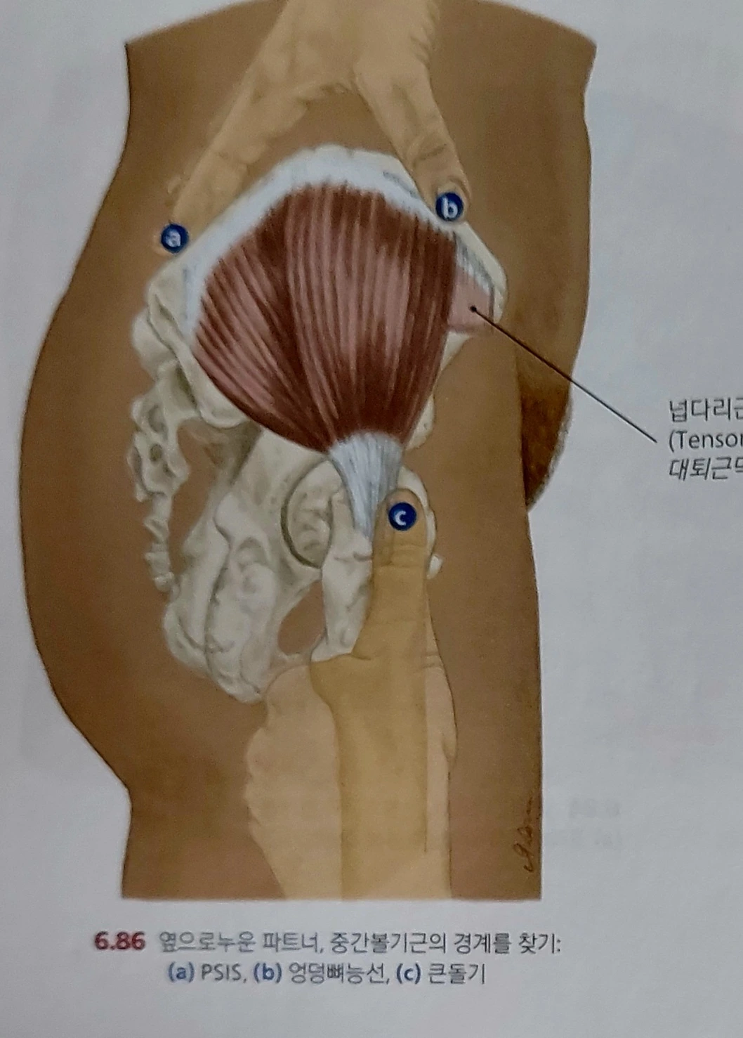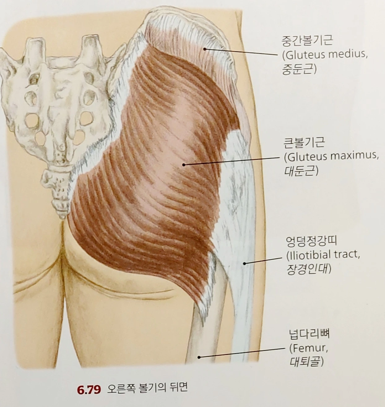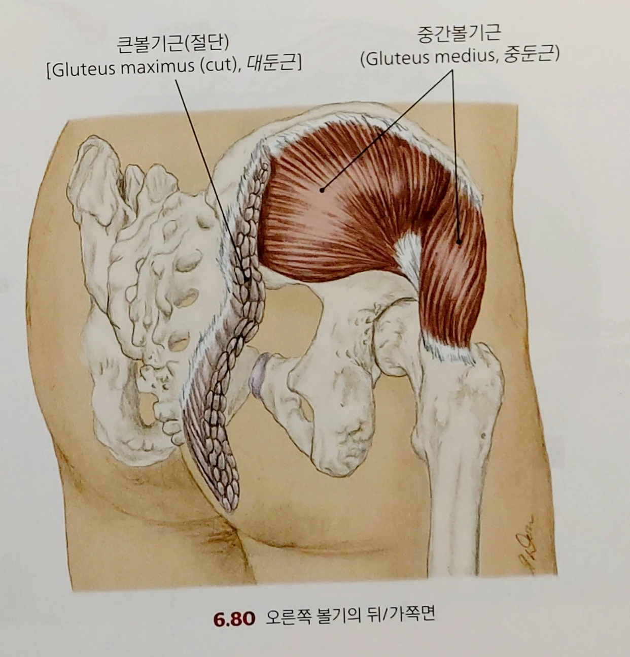 우리 몸은 반원을 그리는 골반 뼈가 양쪽에 있다. 그 아치(arch)를 따라 손으로 만져보면 이렇게나 위에 붙었나, 하고 깜짝 놀란다. 바지가 흘러내려가지 않도록 잡아준 것에도 감사해진다. 반원, 아치, 이 라인(장골 능선)을 말하는 이유는 둔근의 시작을 알리기 위해서다. 엉덩이 뒤편은 대둔근이, 옆은 중둔근이 붙어 사이좋게 땅을 갈랐다. 소둔근은 중둔근 속에 파묻혀 장골능선 땅에는 욕심이 없다.