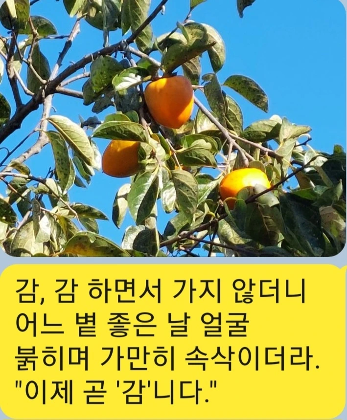 감은 비타민 A, B, C가 풍부하고 기침, 기관지, 심혈관계에 좋은 식품으로 유명하다(백과사전). 고혈압인 아부지 본인, 심장질환자 엄마, 갑작스런 감기가 찾아온 수험생, 아침저녁으로 기침 하는 질녀. 때마침 제때에 나타난 감. 그 김에 감 잡은 아부지 카톡을 다시 열었다. 아부지 걸음과 오감놀이에 더 무르익는 가을이길.