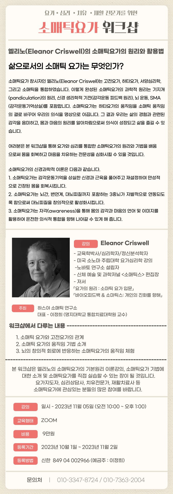 위 솔루션에 해당하는 운동은 <소매틱 요가>다. 매주 월요일 저녁 8시에 전국구로 줌에 접속해 학생부터 어르신까지 소매틱 요가를 수행하고 있다. 소매틱 요가 창시자인 엘리노 크리스웰 교수님 책이 우리나라 번역서로도 나오고 11월에 줌으로도 만났다. 90세가 넘었는데도 나이 차를 못 느꼈다.