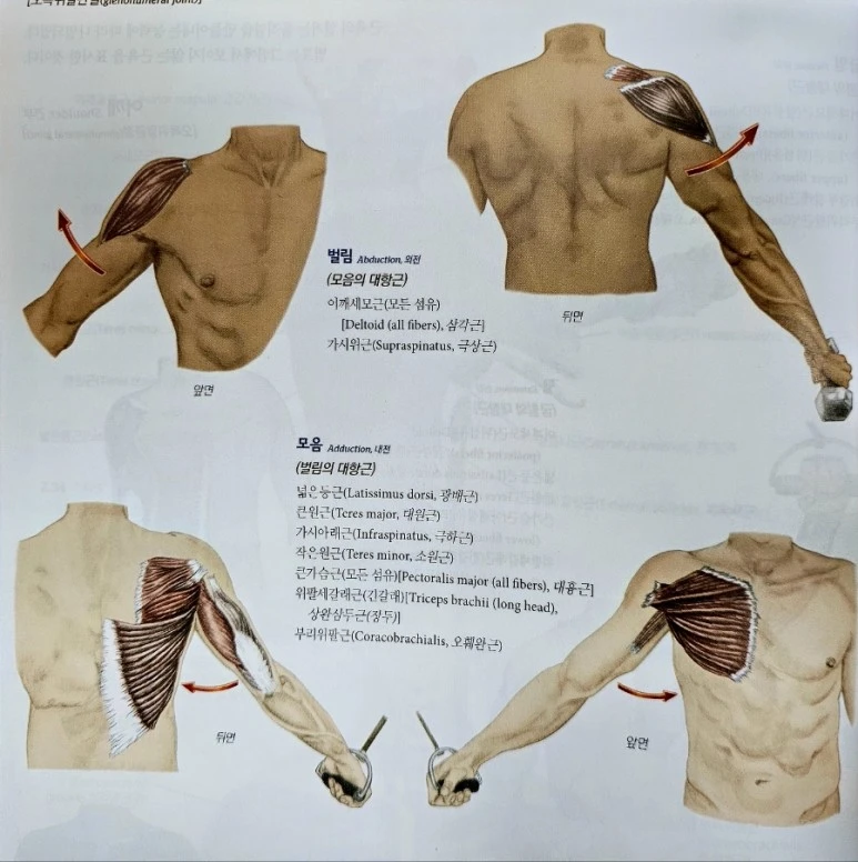 팔을 들어올리면 앞에서 근육 4개가 끌어주고 뒤에서 근육 5개가 당겨주고 옆에서 근육 8개가 밀당을 한다. 근육 이미지를 상상하는 것만으로도 신경근 자극이 꽤 된다.