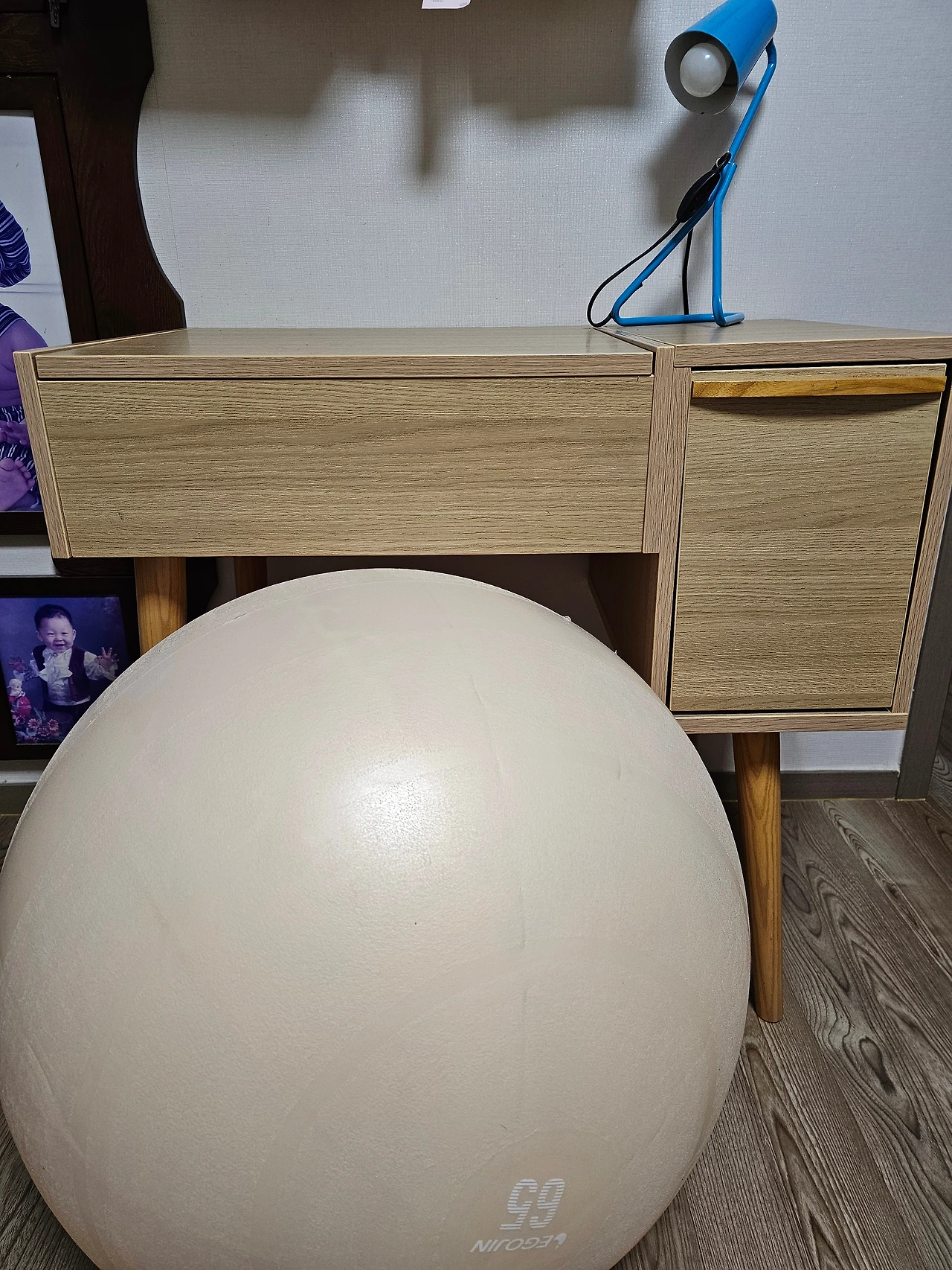 아이가 자란 만큼 가구도 늙었다. 화장대(책상)는 그래도 관절염 하나 없이 튼튼하다. 의자가 문제다. 내 몸처럼 좌우 불균형이 나타났다. 의자에게 의족을 신겨도, 발밑 깔창을 붙여도 좌우로 뒤뚱댔다. 틀어진 골반이 더 비틀려서 의자를 바꿨다. '짐볼'로.