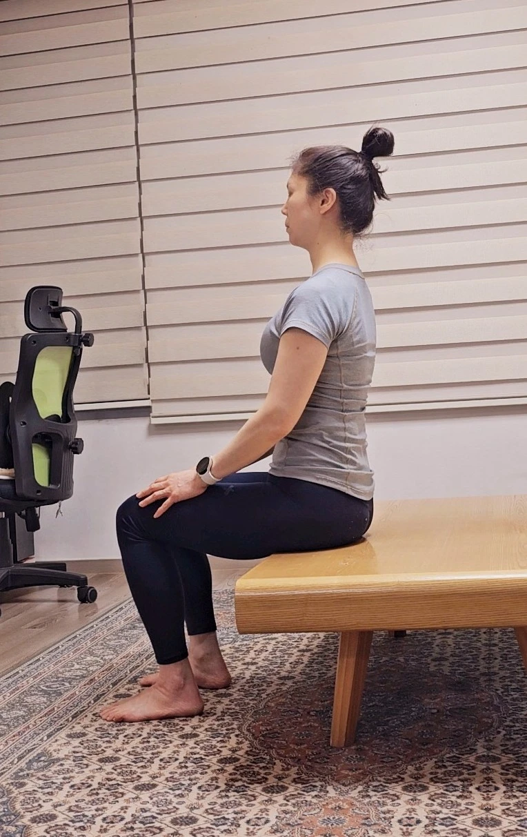 하루 종일 이 자세로 앉아 있긴 힘들지만 발바닥이 바닥에 닿았다면 간간히 척추를 중립으로 세워줄 필요가 있어요.