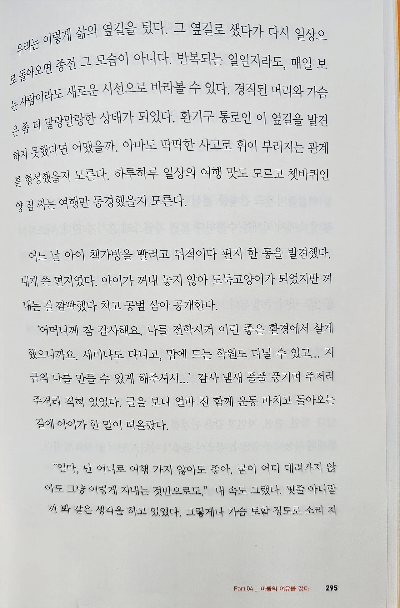 얼마 전 함께 운동 마치고 돌아오는 길에 아이가 한 말이 떠올랐다. "엄마, 난 어디로 여행 가지 않아도 좋아. 굳이 어디 데려가지 않아도 그냥 이렇게 지내는 것만으로도." 내 속도 그랬다. 핏줄 아니랄까 봐 같은 생각을 하고 있었다. 그렇게나 가슴 토할 정도로 소리 지르고 싶었던 곳이 이젠 생각나지 않는다. 현실의 허물을 탁 트인 바다에 벗어 던지고 싶었던 기억조차 바람따라 바다로 떠내려간 것 같다.