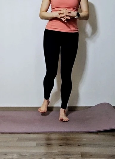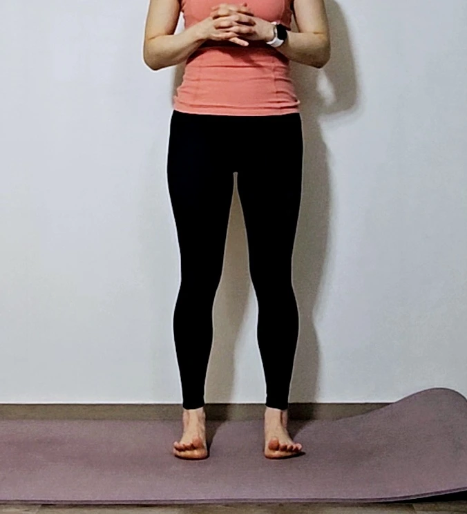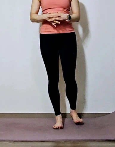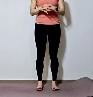벽에 뒤통수, 등, 꼬리뼈가 닿도록 붙이고 발뒤꿈치는 20-30CM 떨어져 서세요. 다리 정렬 다시 맞춰 주세요.