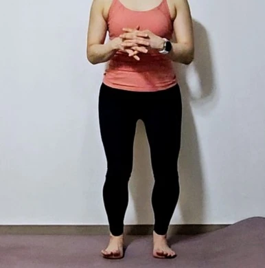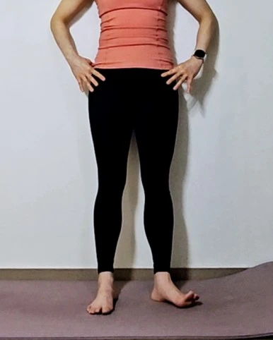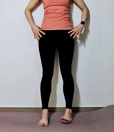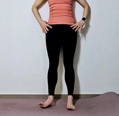 다리 정렬은 발바닥 위치와 관련있다 했죠? 발바닥 인지하는 'Six cells Ex.(식스 셀 엑서사이즈)' 해 볼께요. 두 발 골반너비 평행으로 서 주세요. 두번째 발가락, 무릎과 고관절 가운데를 일직선으로 맞춰 주세요.