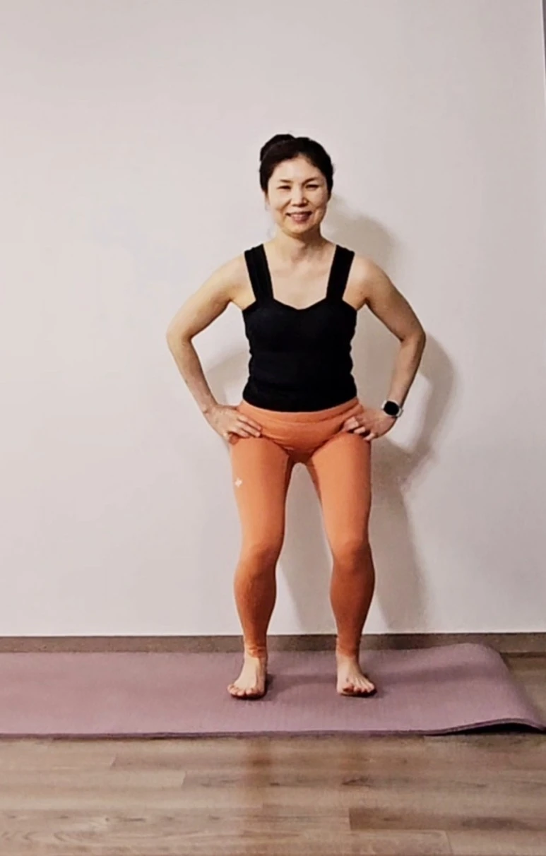 통상 스쿼트 하면 다리를 밖으로 벌려 무릎, 발 같은 방향으로 하는데요. 두번째 발가락과 무릎(고관절)이 일직선인 다리정렬을 유지하는지 확인하기가 쉽지 않아요.