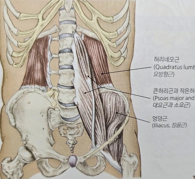 다리가 더 짧은 오른쪽 요방형근을 풀었어요. 요방형근은 갈비뼈와 장골능을 연결한 근육이에요. 이름처럼 네모 모양으로 허리 옆에 직사각형으로 붙어 있어요. 허리통증 주범이자 골반을 옆으로 들어올리는 근육이에요.