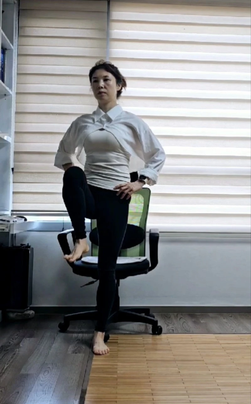 한 발로 서서 할 수 있는 운동은 숱하게 많아요. 한 발로 서는 것만으로도 큰 운동인데 상체, 하체운동을 비롯해 리듬(댄스)까지 더할 수 있어 이건 지정한 날 외에도 의식주운동으로 실시간이죠.