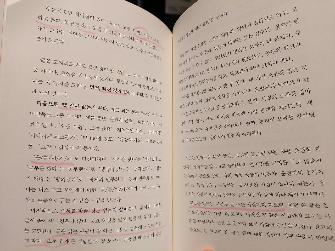 고수는 컴퓨터 모니터에서 보고, 출력해서 종이로도 보고, 소리내 읽어도 본다...손, 눈, 입, 귀를 사용하는 고수와 눈만 쓰는 하수는 결과에서 차이가 크다. 고수는 짧게 여러 번 본다...하수는 길게 한 번 본다. 고수는 장소와 시간을 바꿔가면서 본다. 하수는 그런 노력 자체를 하지 않는다. 고수는 쓴 글을 여러 사람에게 보여준다. 하수는 지적이 두려워 혼자 끙끙 댄다.