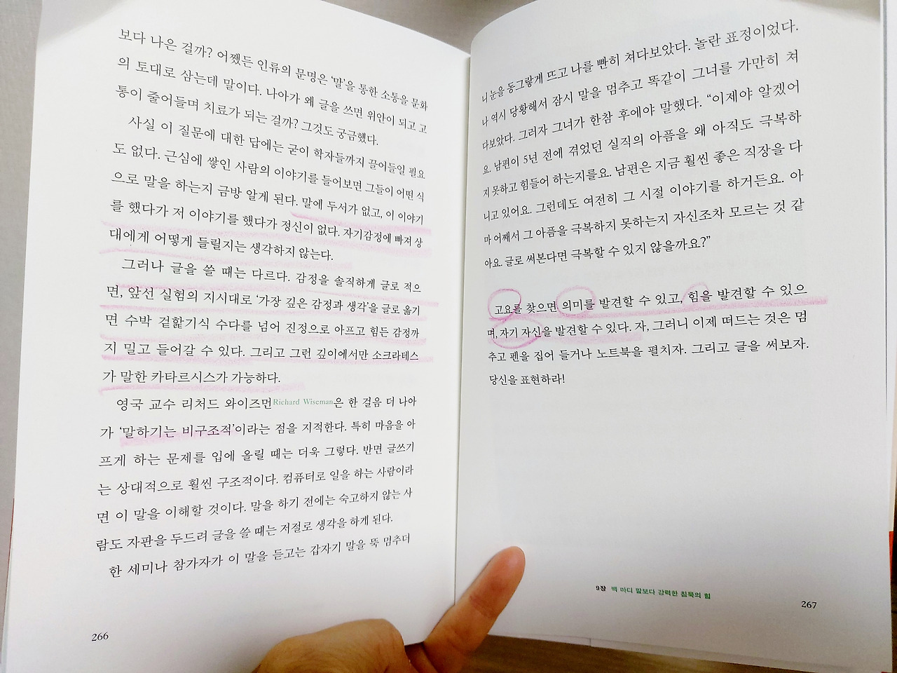 코르넬리아 토프의 『침묵이라는 무기』에서는 고요 속에서 자신을 찾고 마음과 대화를 나누는 길이 운동이라 했다. 또 비구조적인 말하기보다 구조적인 글쓰기로 고요를 찾으면 의미와 힘, 자기 자신을 발견할 수 있다고도 했다. 그런 깊이에서만 소크라테스가 말한 카타르시스가 가능하다며.(운동으로 마음의 평온을 얻는 방법 121p, 가끔은 말보다 글쓰기가 낫다 267p)