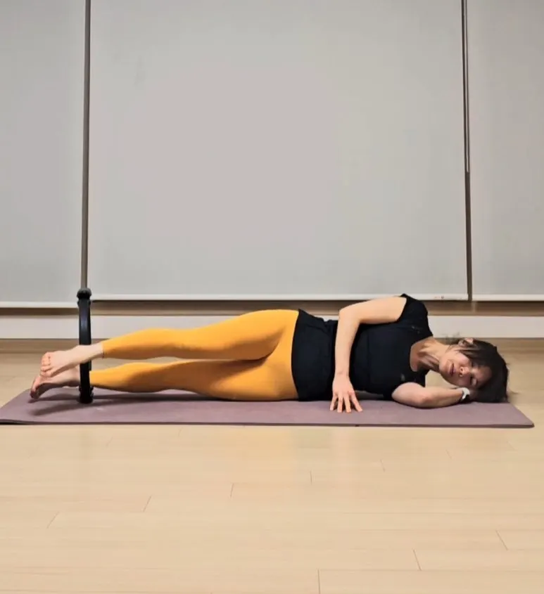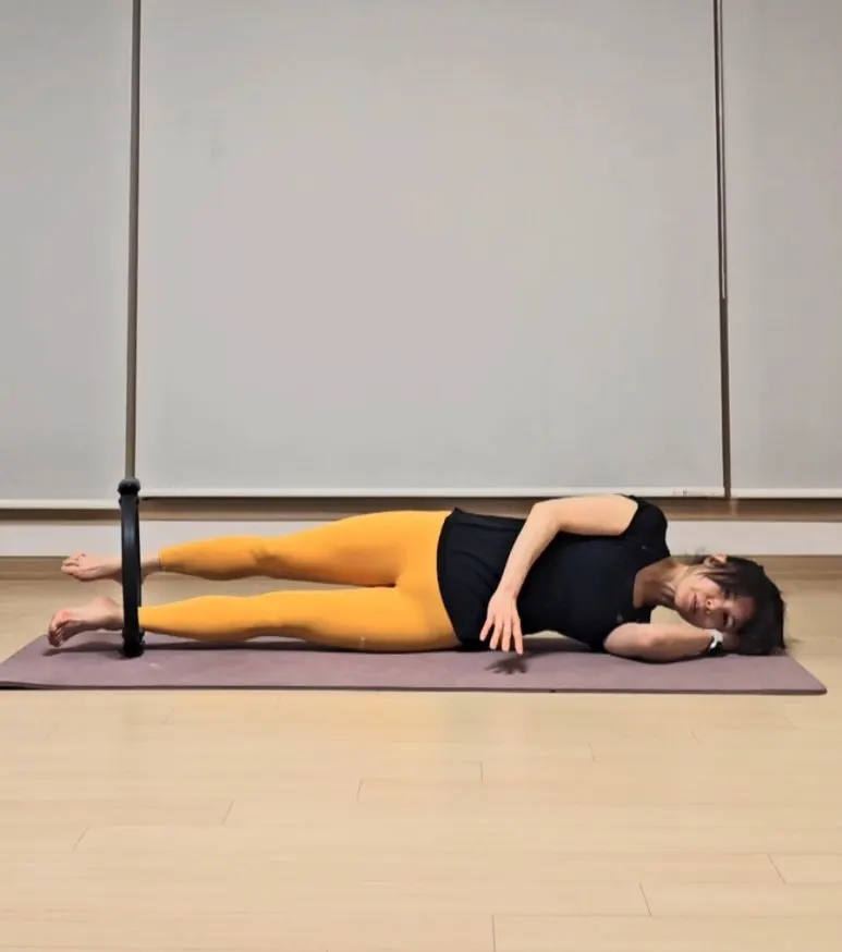 옆으로 누워 아래 다리는 링 안에 넣어요.
