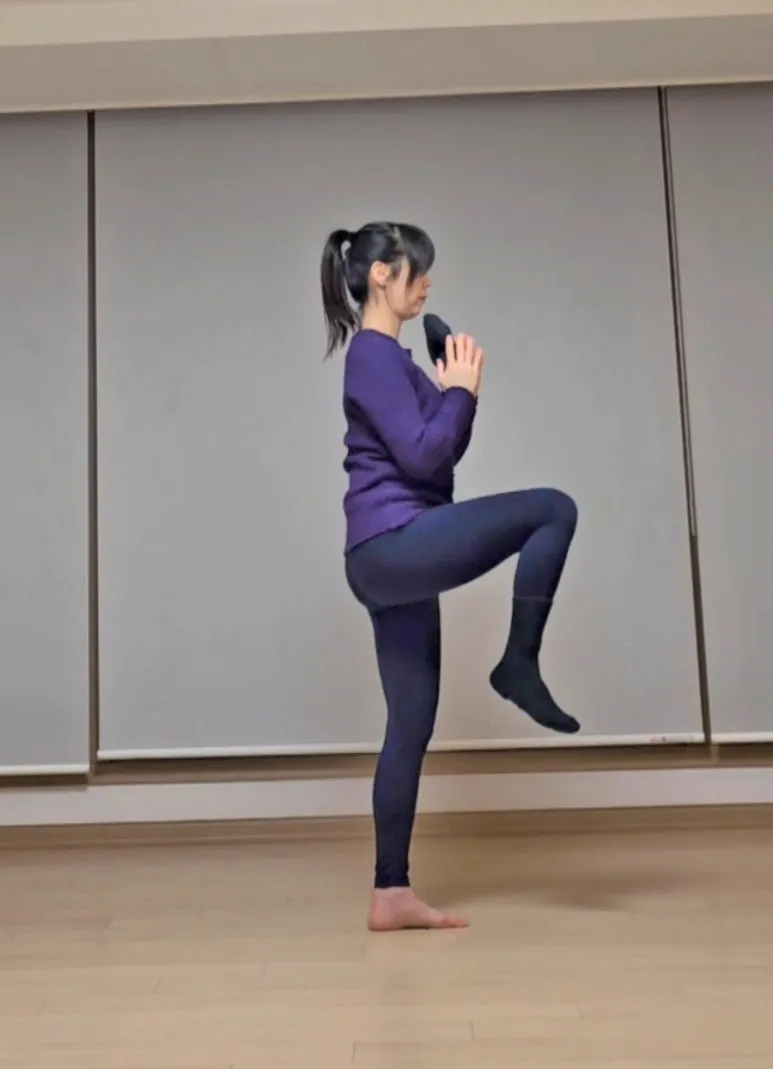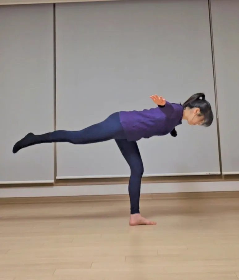 한 다리로 버티고 반대 다리 무릎 접어 올려요. 척추는 최대한 세우고요. 코어에 들어온 힘으로 양말을 신어요. 다 신었으면 곧장 다리를 뒤로 보내 T 포즈를 취해요. 반대쪽 다리 중둔근이 양말을 신겨 준 기념으로 좀 더 코어에 드라이브를 거는 셈이죠.