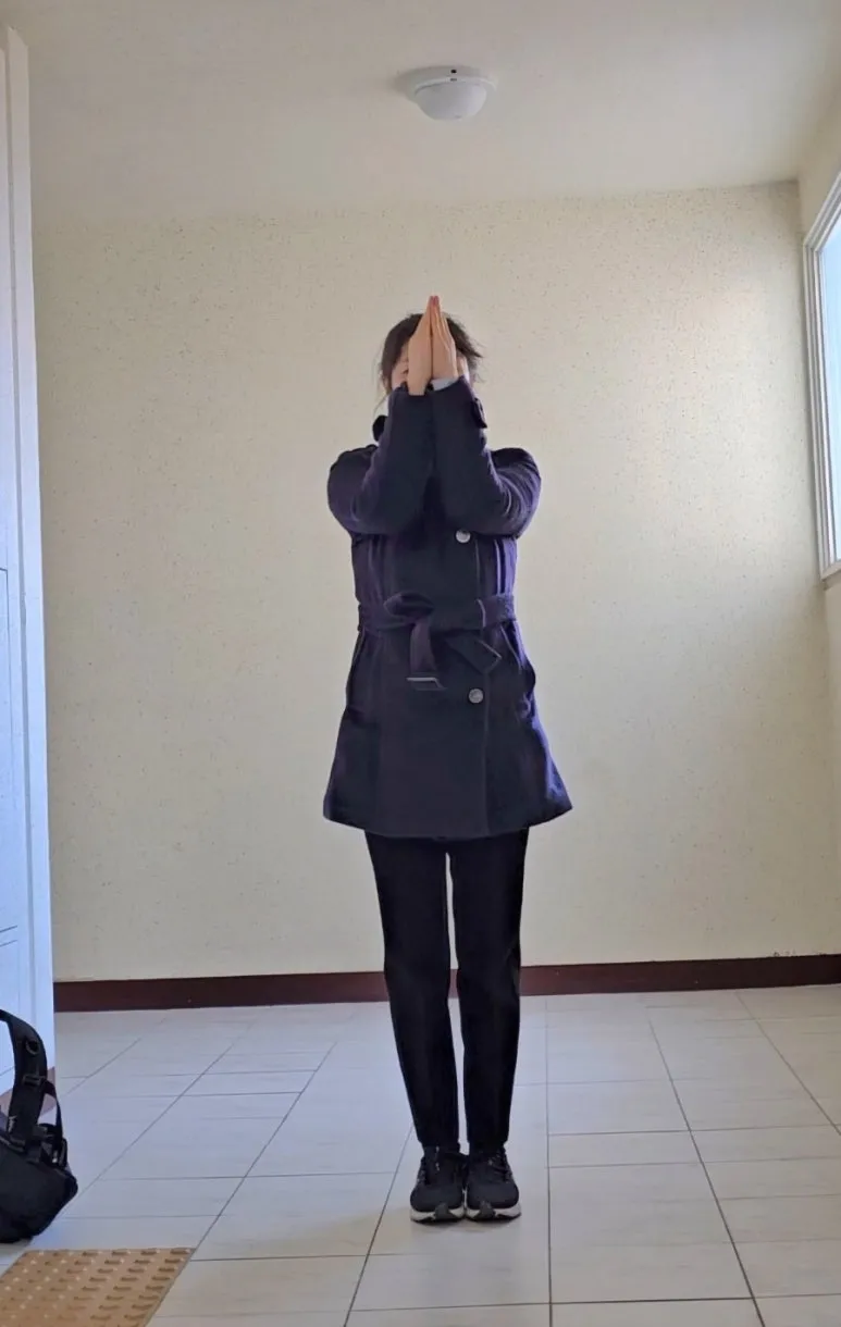 우선, 양손 합장해 팔꿈치까지 붙이고 그대로 위로 들어올려 보세요. 이 장면을 깜빡해 엘리베이터 앞에서 했는데요. 코트 때문에 그렇지, 그래도 팔꿈치가 코까지 옵니다~ 턱 아래에서 멈춘다면 어깨뼈 주변 근육을 풀어 보세요.