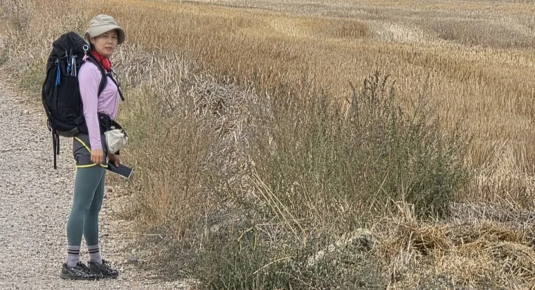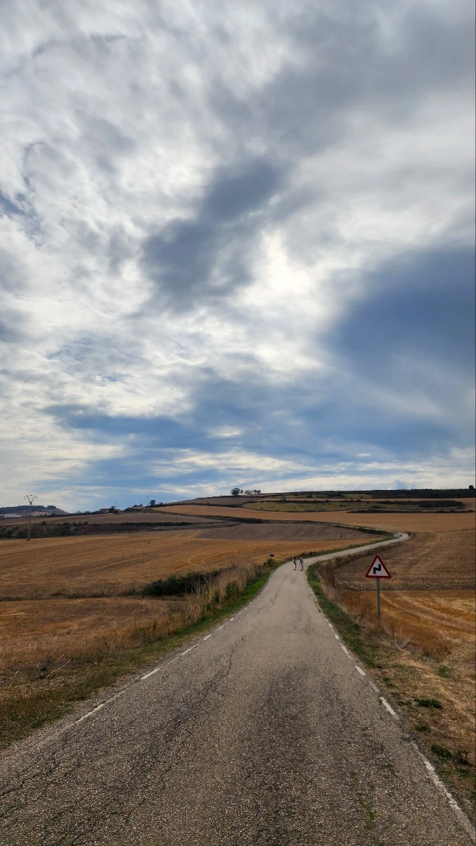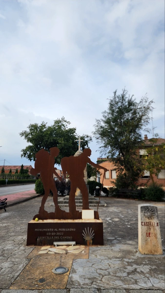 여러 종류의 꽃과 여러 면의 밭을 지나니 그제야 모든 길이 꽃길이었음을 알았다. 지금 이 순간을 누리는 내가 있기까지 모든 게 도움닫기였다. 길 하나하나 번지수마다 '의미'가 달렸었다. 마을을 들락날락하다 보니 철제 순례자 동상이 나왔다. 찻길 건널 때 조심하라고 말하는 듯했다. 마을, 들판, 도로를 반복해서 그런지 배가 또 출출했다. 다시는 바가 없을 것 같아 6km를 남겨 놓고 바에 또 들렀다(비야마요르 델 리오). 화장실도 들렀다는 뜻이고, 밖에 나와 있는 의자에 큰 가방과 나란히 앉아 바람도 맞았다는 뜻이다.